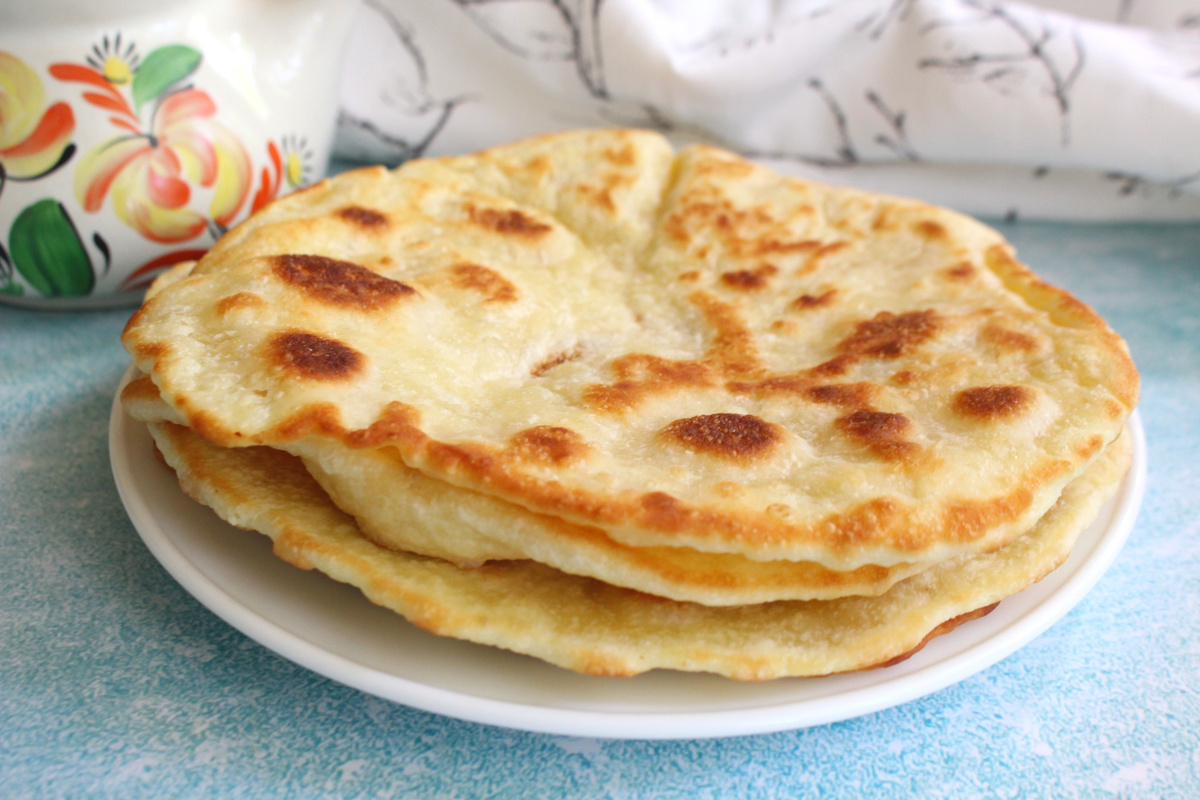 Такие лепешки действительно готовить очень быстро и просто. Тесто тут бездрожжевое, перемешал и можно сразу раскатывать. Раскатывать можно даже не скалкой, а просто растянуть тесто руками и сформировать лепешку. Жарятся они по паре минут с каждой стороны. По рецепту тут количество сахара идет на сладкие лепешки, но всегда можно сахара добавить меньше и будут пресные лепешки. А пресные лепешки можно подать к столу вместо покупного хлеба. Из этого количества ингредиентов получается восемь лепешек средней толщины. Лепешки получаются очень вкусные, в меру сладкие, мягкие, слегка слоистые и они долго остаются мягкие. Майонез - 5 ст.л. Сахар - 3 ст.л. Соль - 0.3 ч.л. Разрыхлитель - 0.5 ч.л. Кипяток - 200 мл. Мука - 450 - 500 г. Масло растительное для жарки В чашку выложим майонез, соль, разрыхлитель и сахар. Вливаем в чашку кипяток и перемешиваем. Добавляем в чашку муку и замешиваем тесто. Тесто должно быть мягкое, оно может немного липнуть к рукам. Смазываем руки и рабочую поверхность расти