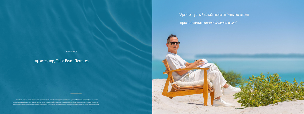 Коичи Такада - всемирно известный, отмеченный наградами архитектор, который видит в природе непревзойденного художника. В Fahid Beach Terraces его философия дизайна воплощается в плавных формах и изменчивых пространствах, которые отражают ритм береговой линии. От плавно изгибающихся балконов, вдохновленных отпечатками приливов , до генерального плана, который уравновешивает движение и неподвижность, каждый элемент отражает его веру в то, что жизнь становится богаче, когда мы живем в гармонии с природой.
