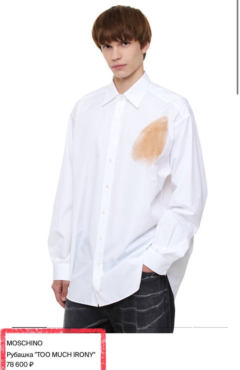 Moschino выпустил рубашку с отпечатком от утюга за 78 000₽, а если это покажется дорогим, можно начать с футболки с таким же принтом за 35 000₽.