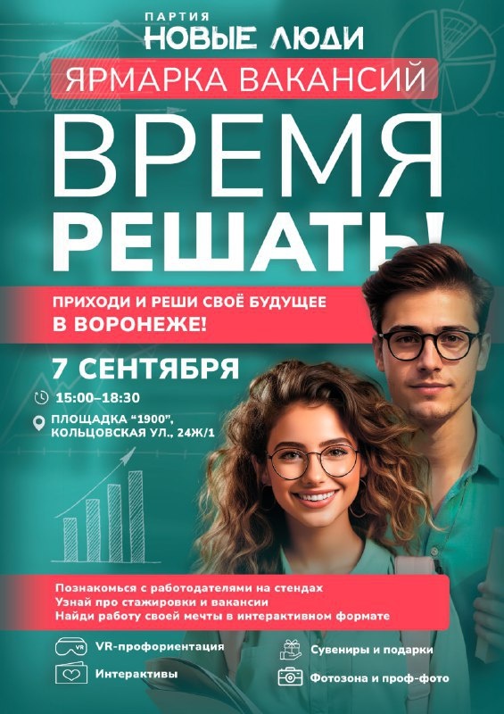 Студенты и выпускники школ приглашаются на ярмарку вакансий в Воронеже. Мероприятие пройдет 7 сентября на площадке «1900». Оно будет открыто с 15 до 17 часов. На фестивале представлены ведущие компании региона. Гости смогут лично пообщаться с работодателями и узнать об актуальных вакансиях и стажировках. Посетителей ждет: - VR-карьерное ориентирование; - интерактивные площадки; - профессиональная фотосессия бесплатно; - полезные призы и памятные сувениры. Фестиваль предоставит уникальную возможность студентам и школьникам выбрать будущую профессию и трудоустройство. Для участия необходима предварительная регистрация через специального бота.