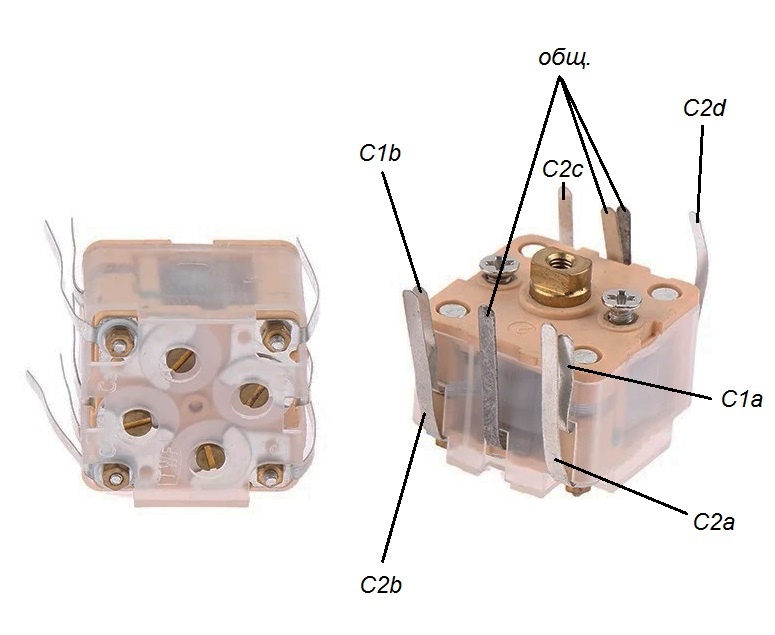 Как бы ни были хороши по своей стабильности конденсаторы переменной емкости с воздушным диэлектриком, но пленочные КПЕ компактнее, дешевле, доступнее, с ними не рискуешь деформацией и замыканием пластин при хранении или наладке устройства. А на невысоких частотах, вроде 160-метрового радиолюбительского диапазона, стабильность частоты с ними, особенно после прогрева аппаратуры и окончания выбега, может оказаться вполне себе терпимой даже для SSB-аппаратуры. Так что же самого доступного в этом плане может предложить Алиэкспресс? Ну, вот она - практически кубическая пластмассовая коробочка со стороной чуть больше 2 см, включающая в себя основной двухсекционный КПЕ и 4 подстроечных конденсатора (триммера). У хорошего продавца поставляется в комплекте с удлинителем оси, длинным винтом для его крепления, а также двумя короткими винтиками М2,5 для крепления самого конденсатора. Начинаем разбираться с цоколевкой. Будем "плясать от печки" - от оси, которая, как и у большинства КПЕ, должна соеди