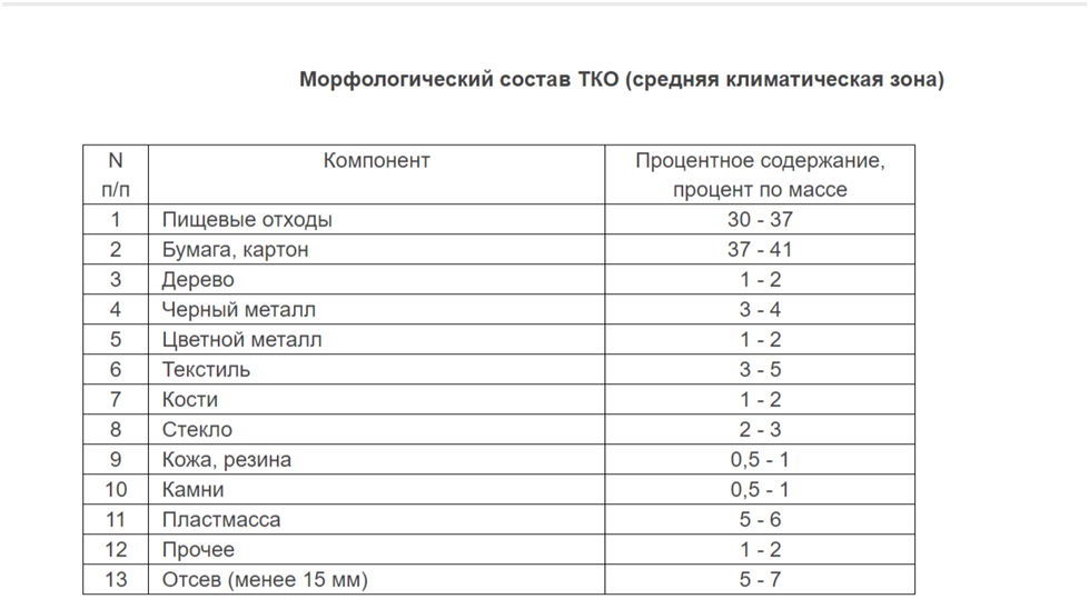 По данным информационно-технического справочника по наилучшим доступным технологиям ИТС-15-2021 «Утилизация и обезвреживание отходов (кроме термических способов)», введенного в действие 01.06.2022 приказом Федерального агентства по техническому регулированию и метрологии от 22.12.2021 N 2964 «Об утверждении информационно-технического справочника по наилучшим доступным технологиям», «Утилизация и обезвреживание отходов (кроме термических способов)», усредненный морфологический состав ТКО в средней климатической зоне Российской Федерации представлен следующими компонентами (таблица 1):
