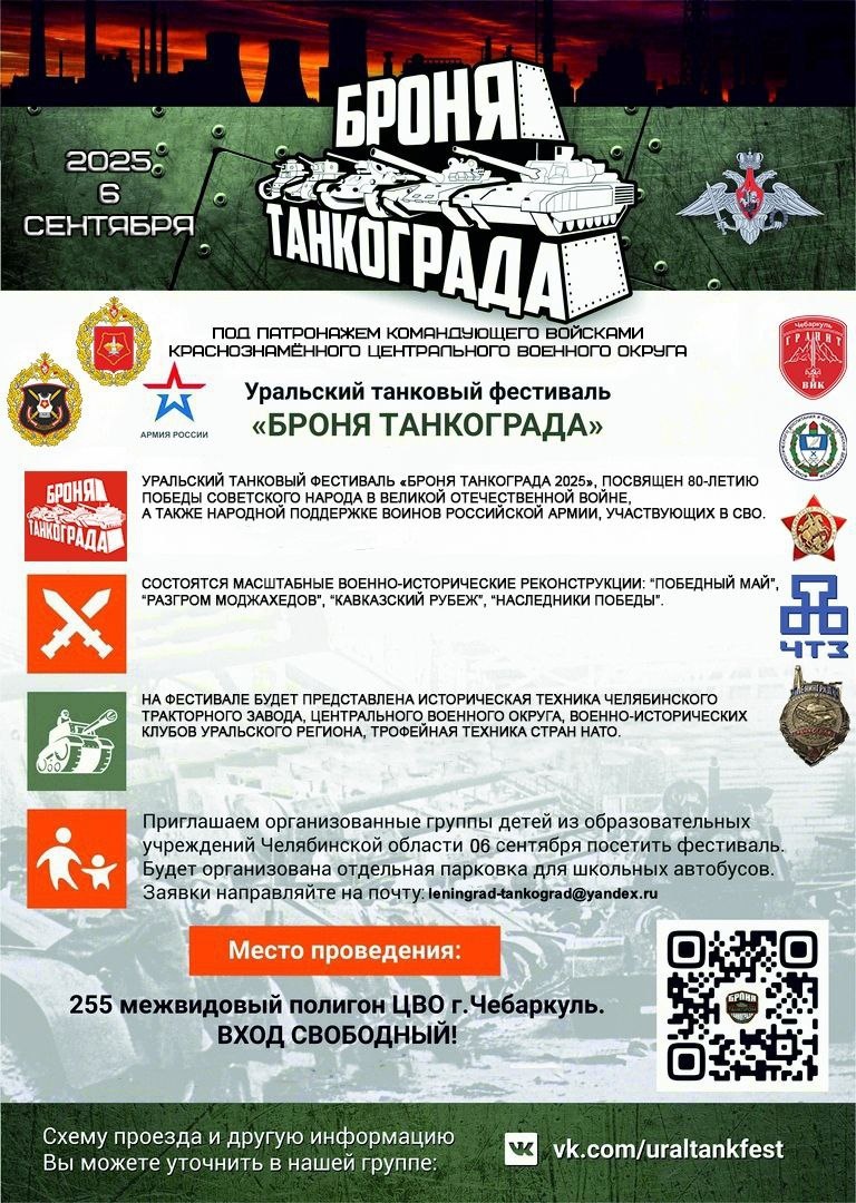 Дорогие друзья! ‼️ Напоминаем, 6 сентября 2025 года, на 255 межвидовом полигоне на территории Чебаркульского муниципального района состоится Уральский Танковый Фестиваль «Броня Танкограда - 2025». Центр "Авангард" активно участвует в проведении мероприятий. 🇷🇺 Ждем земляков всех возрастов на легендарном Чебаркульском полигоне! vk.com/wall-198767909_2525