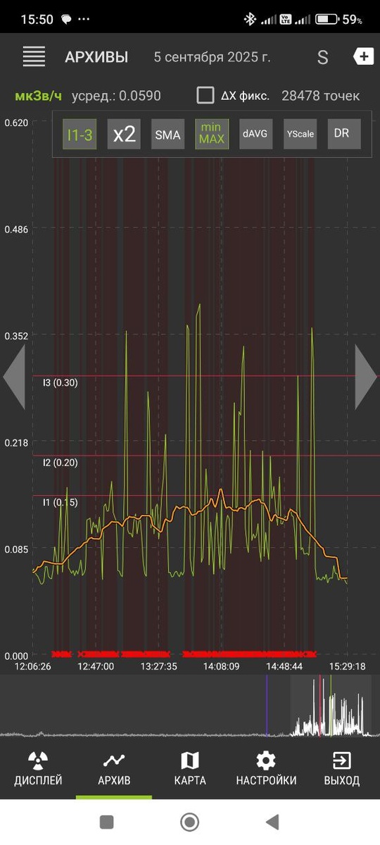 А вот график мощности дозы записанный дозиметром Atom Swift. Сколько же я получил?🤫