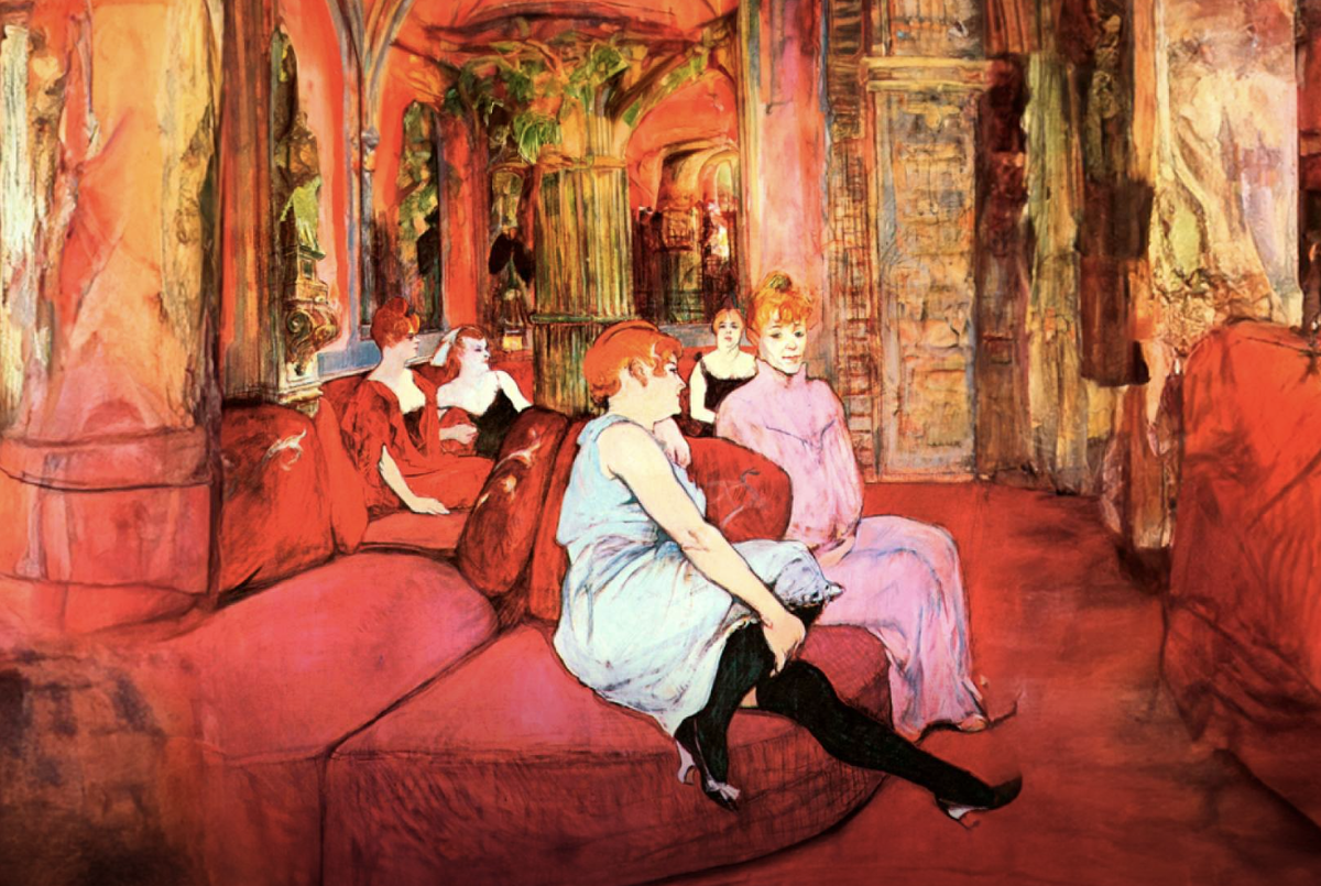 Анри де Тулуз-Лотрек рисовал не сцену — он рисовал тех, кто жил на грани. Его не интересовали идеалы. Он писал реальность: женщин, которые танцевали до изнеможения, смеялись сквозь усталость, скрывали боль под макияжем. Он не наблюдал издалека — он был одним из них. Его Париж — не открытки и мосты, а кабаре, мюзик-холлы, бордели. Там, где жизнь не притворяется красивой, она просто идёт, со светом рампы и красным вином на губах. Мулен Руж стал его сценой и мастерской. Там он рисовал прямо за столиком, создавал афиши и портреты. Его героини — настоящие. Дерзкая Ла Гулю, звезда канкана, способная одним движением выбить шляпу у зрителя. Призрачная Жанна Авриль, будто танцующая внутри собственной боли. Женщины из домов терпимости, которых он не идеализировал — но и не унижал. Он видел их не как «ночных бабочек», а как людей: усталых, живых, честных. Лотрек сам жил на обочине светской жизни. Маленький рост, врождённое заболевание, отчуждение со стороны общества — он не был своим среди буржуа