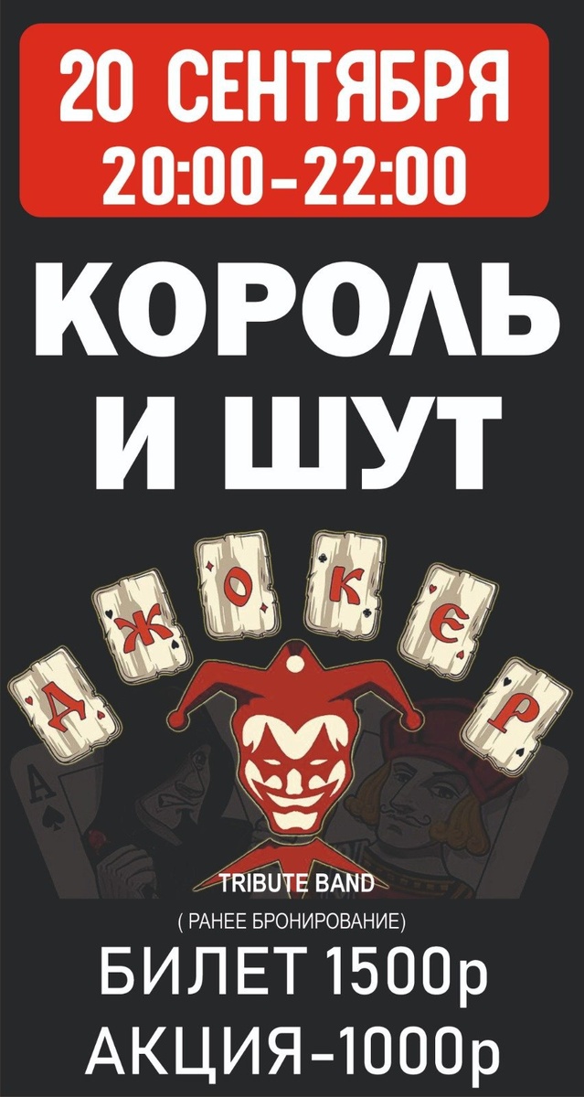 🎸Друзья! 20 сентября в 20:00 в Еленовке состоится незабываемое музыкальное событие — концерт КОРОЛЬ и ШУТ в исполнении рок-банды «Джокер