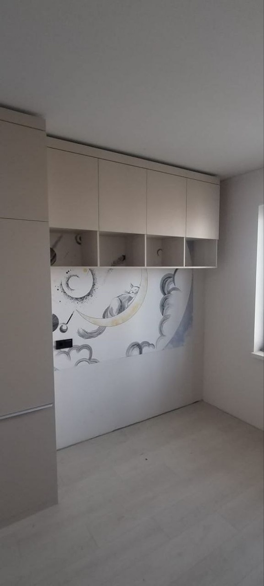 В просторной комнате шириной 6 метров создана уютная детская для мальчика и девочки, где каждому выделено своё личное пространство благодаря грамотной зонировке. В едином стиле выполнены шкафы и рабочие зоны, что придаёт интерьеру гармоничность и завершённость. Центральным элементом выступает шкаф с двумя отделениями — по одному для каждого ребёнка. Над шкафом расположены антрессольные модули с полками, на которых установлены петли с доводчиками для плавного закрывания. Под антрессолями предусмотрены кровати, обеспечивающие комфорт и уют. На противоположной стене размещены функциональные рабочие места с подсветкой: просторные столы и открытые полки для книг и учебной литературы. Толщина столешниц — 32 мм, что гарантирует прочность и долговечность. Вся детская выдержана в единой светло-бежевой гамме «Велютто», а открытые полки изготовлены из ЛДСП светлого ясеня Анкор, создавая атмосферу легкости и уюта в комнате.