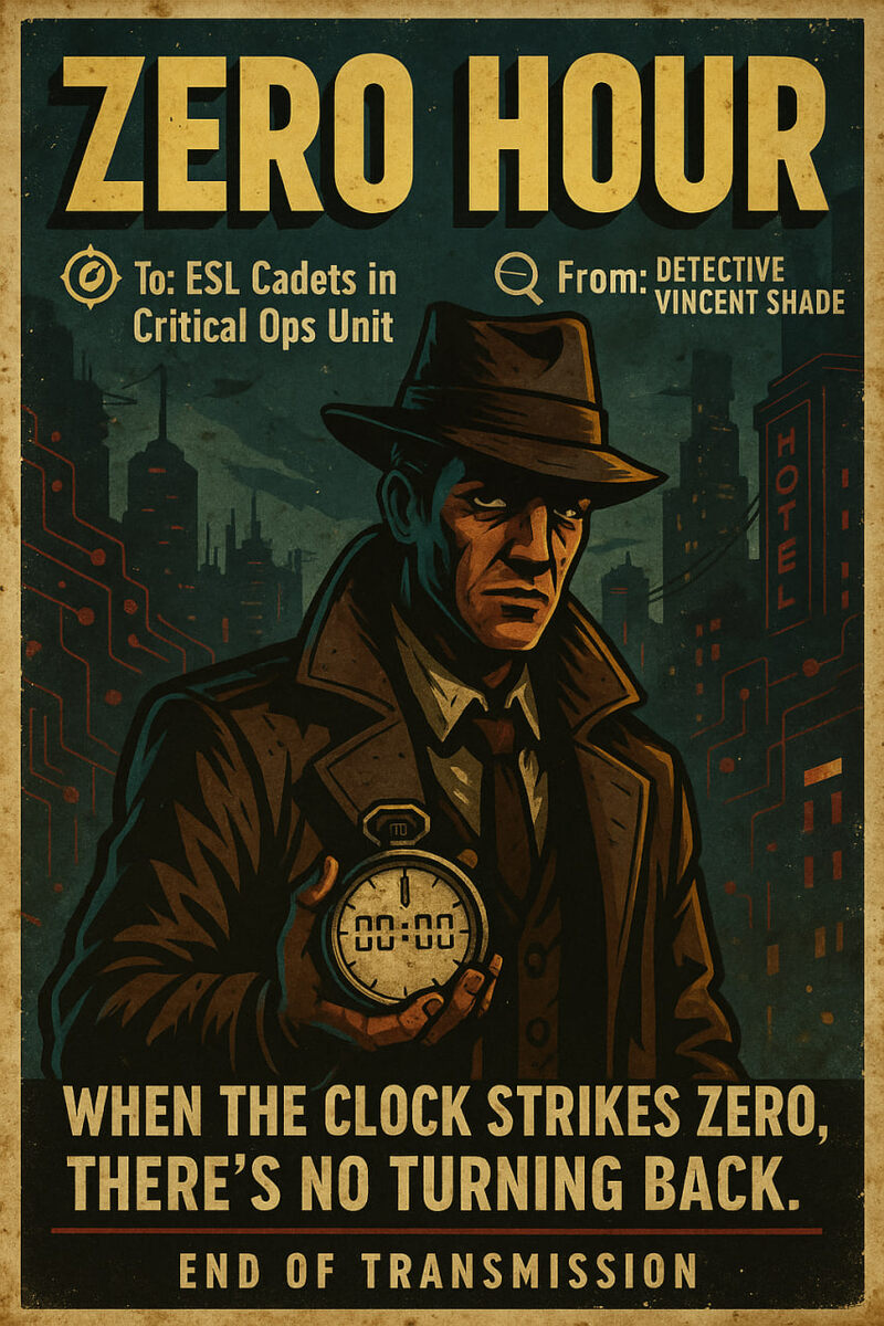 📄 Шпаргалка по сленгу: «Zero Hour» 🧭 Кому: Курсантам ESL в подразделении критических операций и сценариев обратного отсчёта 🔍 От: Департамента тактического английского и временной точности GS 📅 Дата: 6.10.2025 🎯 Цель миссии Освоить сленговое выражение «zero hour» — термин с военным происхождением, который используется для обозначения точного момента начала запланированной операции, события или критического действия. 🧠 Определение Zero hour (существительное) — изначально военный термин, обозначающий назначенное время начала атаки или миссии. В повседневном английском означает решающий или критический момент, когда должно начаться что-то важное. 💬 Примеры в поле 🛠 Тактические советы по использованию 🧩 Грамматическая разведка Функционирует как именная фраза. В формальном стиле обычно с артиклем («the zero hour»), в разговорной речи артикль часто опускается. Может использоваться в переносном значении (“Zero hour for our friendship was when the truth came out” - «Zero hour для наш