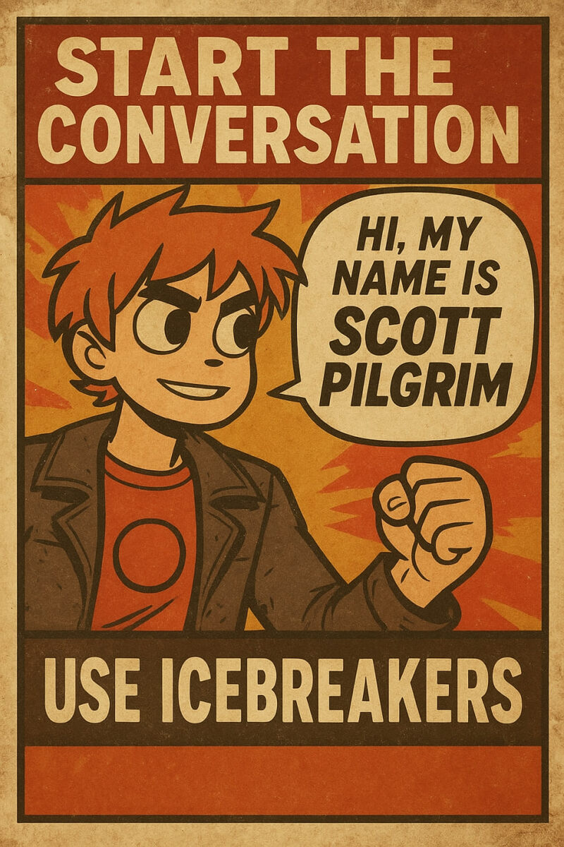 📄 Icebreaker Ops – “The Scott Pilgrim Starter Pack” 🧭 To: ESL Cadets of Social Encounters & Conversation Division 🔍 From: GS Department of Tactical English & First Contact Protocol 📅 Date: 8.10.2025 🎙 Transmission Start: Scott Pilgrim Reporting “Talking to people is like starting a boss fight. You don’t need the perfect move — you just need to hit START.” This mission isn’t about memorizing boring lines. It’s about breaking the ice like smashing through the first level — awkward, funny, and totally effective. 🎯 MISSION OBJECTIVE Train cadets to: 🔹 Start conversations naturally, not mechanically 🔹 Use playful icebreakers to grab attention 🔹 Build comfort and humor into first contact 🔹 Turn awkward silence into epic dialogue 💬 VOCABULARY DROP: ICEBREAKER ESSENTIALS 🎭 SCOTT PILGRIM’S ICEBREAKER RULES 🔹 Rule 1: Be Boldly Awkward ✔️ “So, if you were a video game character, what would your special attack be?” ✘ “Hi.” 🔹 Rule 2: Go Random or Go Home ✔️ “Do you think pizza counts