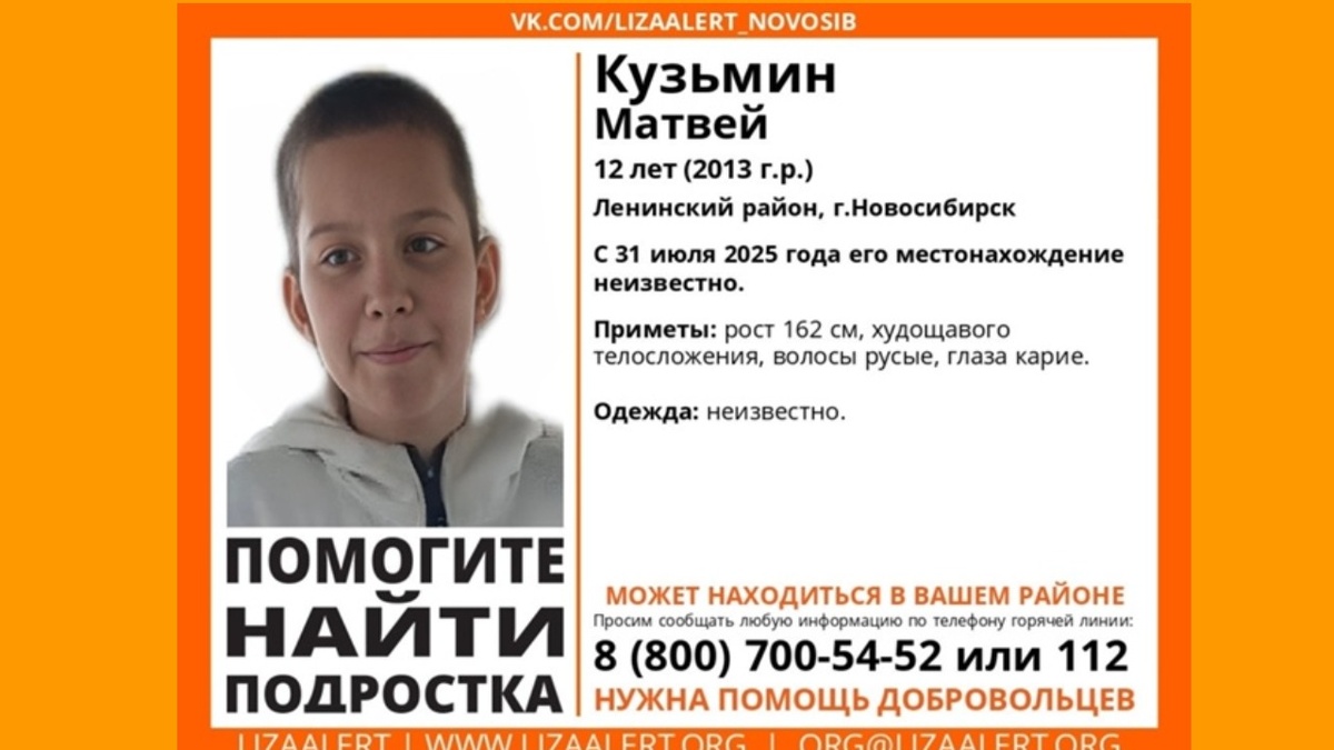 12-летний Матвей исчез 31 июля 2025 года в Ленинском районе областной столицы. С тех пор он ни разу не вышел на связь с родственниками. О местонахождении ребёнка ничего неизвестно. По данным новосибирского отделения отряда «ЛизаАлерт», рост пропавшего мальчика 162 см, у него худощавое телосложение, русые волосы и карие глаза. Информации о том, во что он был одет в день исчезновения, нет. Поиски школьника продолжаются. Волонтёры надеются на помощь жителей города.