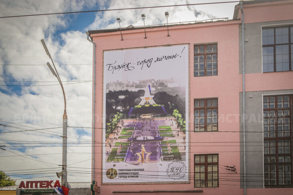 Продолжается украшение центра Советского района к празднованию Дня города. В этом году Брянску исполняется 1 040 лет. Идея поздравить горожан с юбилеем родного города, сделав необычные баннеры, возникла на совещании у главы администрации областного центра Александра Макарова ещё в конце 2024 года. Специалисты отдела дизайна управления по строительству и развитию территории города Брянска разработали макеты двух первых баннеров, украсивших фасады домов на проспекте Ленина минувшей весной. Было принято решение использовать стихотворения известных брянских поэтов. На одном баннере написано четверостишье Ильи Швеца, на втором — Владимира Сорочкина. Каллиграфический почерк принадлежит руководителю Советского района Денису Семёнову. Новый баннер — не исключение. «Для третьего баннера мы с Александром Николаевичем решили использовать слоган: «Брянск – город мечты». Он обосновал это тем, что за нашим городом стоит более чем тысячелетняя великая история. Я согласен с этим полностью, но добавлю
