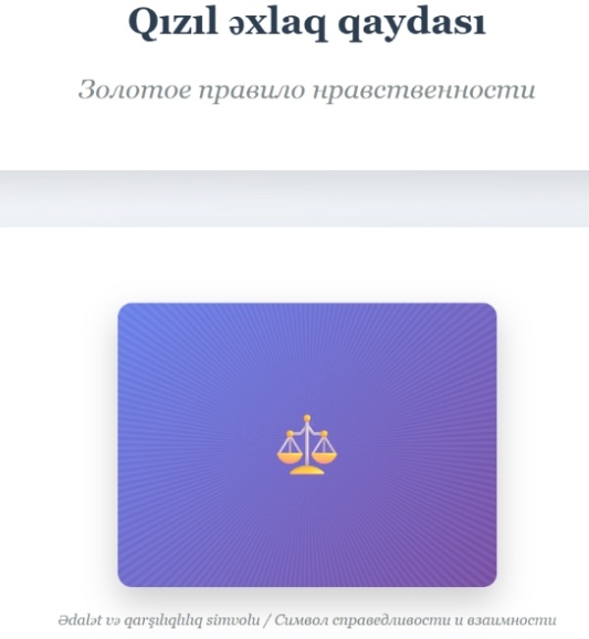 Золотое правило нравственности – это универсальный принцип, который встречается в разных культурах и религиях. Его суть заключается в том, чтобы относиться к другим так, как ты хотел бы, чтобы относились к тебе. 🌍 Müxtəlif mədəniyyətlərdə / В разных культурах Azərbaycanca: Xristianlıqda: «Başqalarına elə davran ki, sənə də elə davransınlar». İslamda: «Qardaşına özün üçün istədiyini istə». Konfutsiçilikdə: «Özünə istəmədiyini başqasına etmə». По-русски: В христианстве: «Поступай с другими так, как хочешь, чтобы поступали с тобой». В исламе: «Желай брату своему того же, чего желаешь себе». В конфуцианстве: «Не делай другим того, чего не желаешь себе». Azərbaycanca: