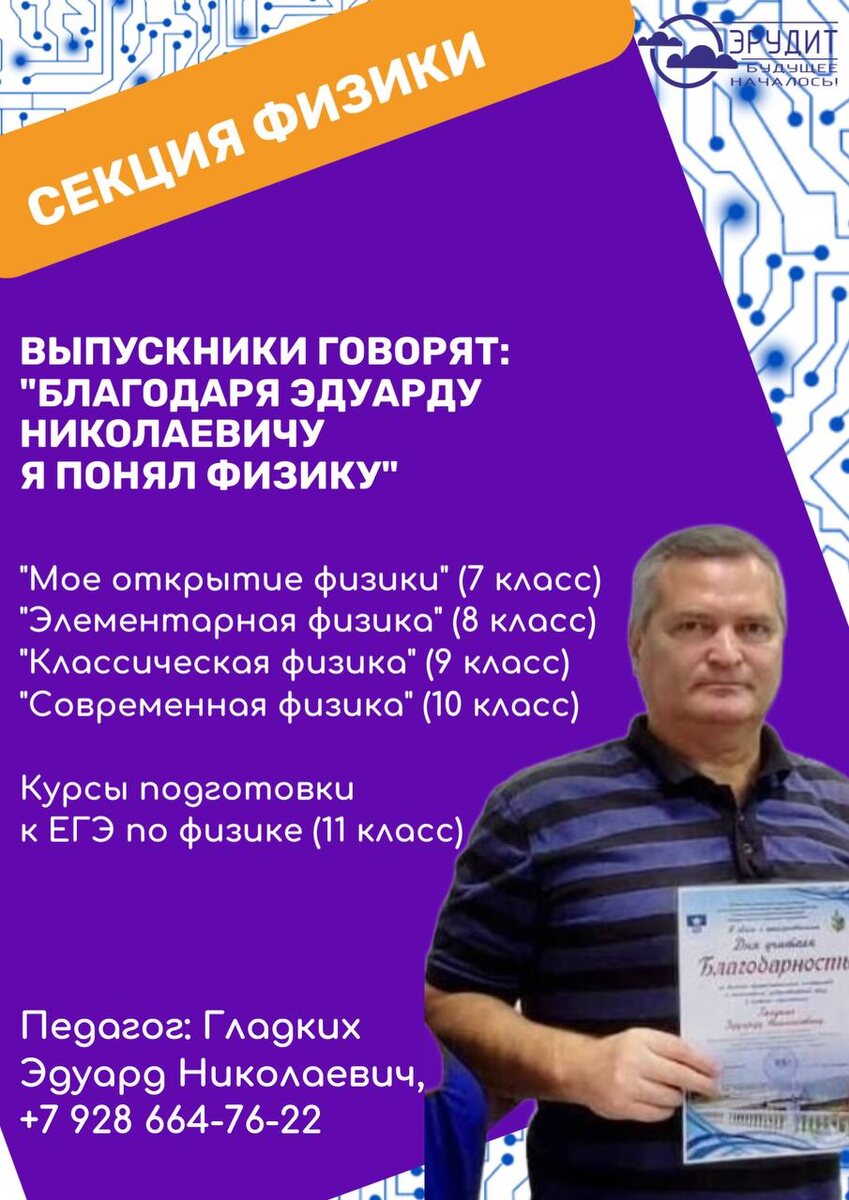 СЕКЦИЯ ФИЗИКИ 📚 Знаем, что Эдуард Николаевич не нуждается в представлении 😉 Просто напоминаем 👇🏻 - сдать экзамены на высший балл - это к нам! - понять и даже полюбить физику на самых первых этапах - это тоже к нам! Все вопросы Вы можете задать педагогу лично - номер указан в карточке 😉 Ждем Вас! 📚