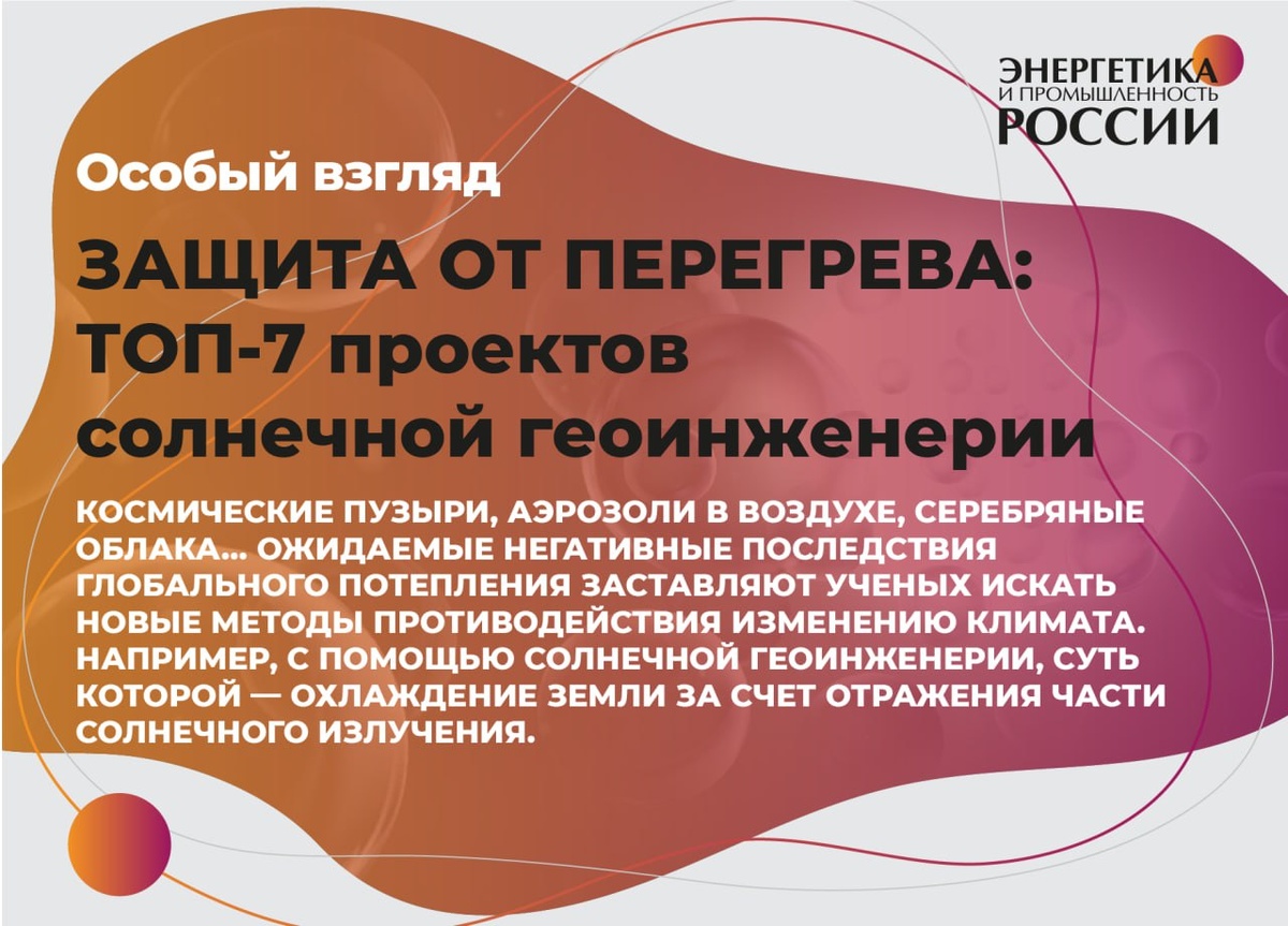 ✅ В номере №15-16 (516-517) газеты "Энергетика и промышленность России" вышел материал "Защита от перегрева: ТОП-7 проектов солнечной геоинженерии" 📝Космические пузыри, аэрозоли в воздухе, серебряные облака… Ожидаемые негативные последствия глобального потепления заставляют ученых искать новые методы противодействия изменению климата. Например, с помощью солнечной геоинженерии, суть которой - охлаждение Земли за счет отражения части солнечного излучения. В отличие от сокращения выбросов CO₂, применение таких разработок не устраняют причину изменения климата, а лишь временно маскируют его последствия. Журналист «ЭПР» изучил крупнейшие эксперименты в области солнечной геоинженерии за последние 5 лет. 🔎Топ-5 новостей нового номера и другие материалы - на портале ЭПР 🌐Наше сообщество в VK #ЭПР #Новости_энергетики