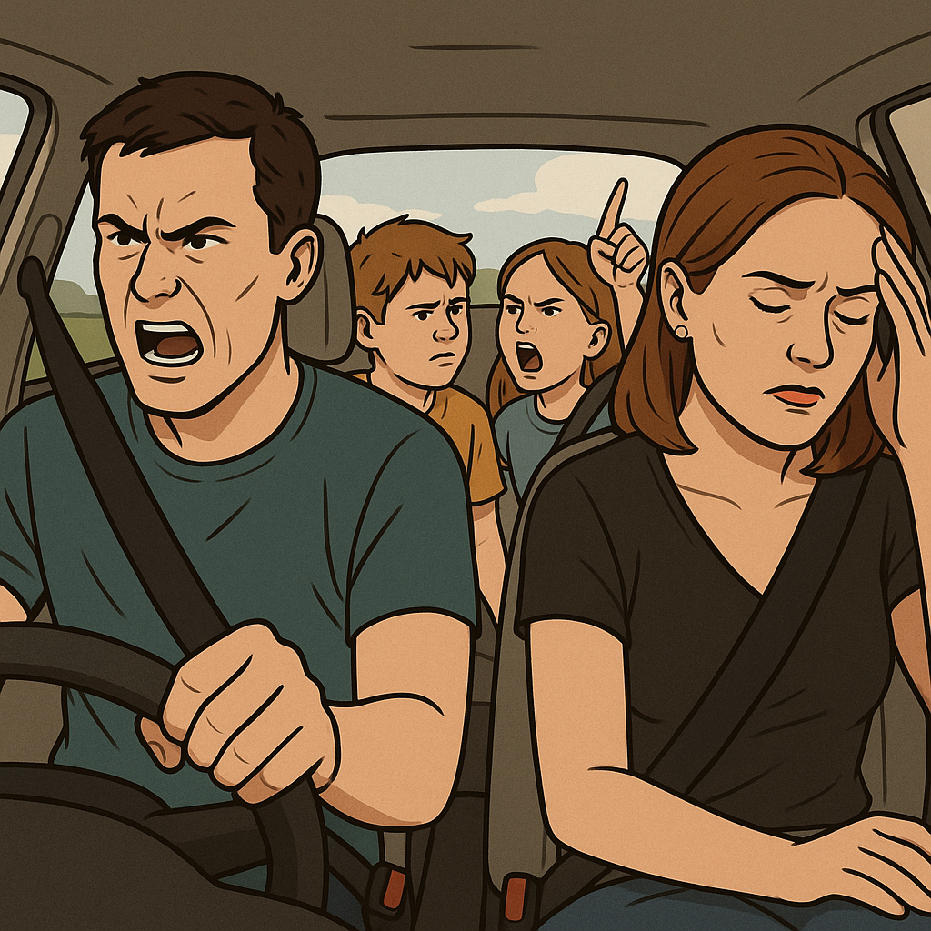 Пассажирское кресло превращается в переговорный пункт, водитель пытается не сорваться, заднее сиденье — в зону боевых действий. Родители начинают спорить между собой: кто должен был взять игрушки, почему не скачали мультики и кто вообще придумал этот маршрут.