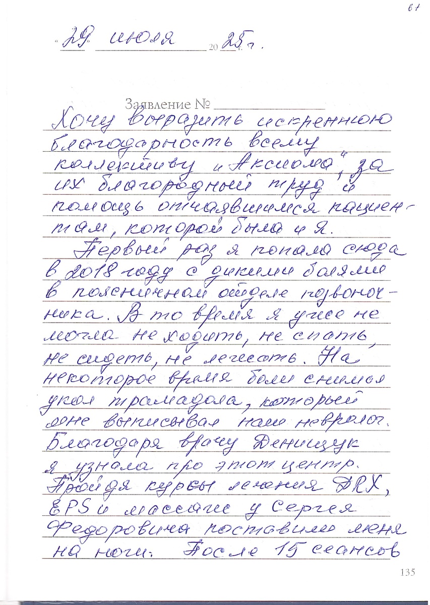 29 июля 2025 г. Заболотная З.П. 65 лет. Хочу выразить искреннюю благодарность всему коллективу «Аксиома», за их благородный труд и помощь отчаявшимся пациентам, которой была и я! Первый раз я попала сюда в 2018 году с дикими болями в поясничном отделе позвоночника. В то время я уже не могла не ходить, не спать, не сидеть, не лежать. На некоторое время боли снимал укол трамадола, который мне выписывал наш невролог. Благодаря врачу Денищуку я узнала про этот центр. Пройдя курсы лечения DRX, EPS и массажа у Сергея Федоровича поставили меня на ноги. После 15 сеансов я ужу могла сидеть без боли и спать. Окончив курс лечения, полностью восстановилась через 3 месяца. Боли прошли окончательно. В 2019 году пришла еще раз на те же процедуры, чтобы закрепить результат лечения. В этом году почувствовав первые симптомы и приобретя к бывшим грыжам еще новые, пришла вновь на процедуры. Сейчас чувствую себя хорошо. Последнее время у меня очень сильно стали отекать ноги и болеть. Хорошо, что в «Аксиом