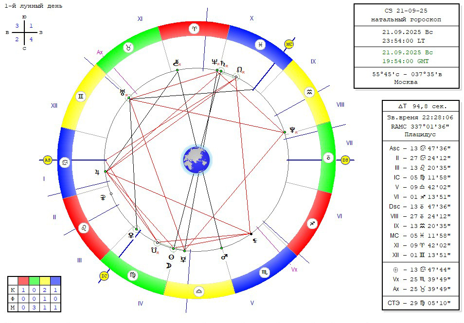 Смотрю карту солнечного затмения 21 сентября. Карты затмений, построенные на столицу, несут информацию о социальных, экономических событиях, о природных явлениях, которые произойдёт в ближайшие полгода. И вот карта затмения 21 сентября построенная на Москву выглядит тревожно. В точнейшей оппозиции к затмению, менее 1°, находится Сатурн – планета infortune major, как называли его в средние века – главный предвестник как-то бедственных событий, катаклизмов. Рядом с Сатурном находится Нептун, он также в оппозиции с затмением, с погрешностью чуть более 1°, что по меркам астрономии, тем не менее является точным показателем конфигурации. Нептун – это планета многих стихийных бедствий, социальных потрясений… и эпидемий. Оппозиция выстроилась в 4 и 10 полях карты. Да, обратите внимание, те, кто учился у меня, и вообще следит за моими работами, знает, что в предсказаниях судьбы отдельного человека я использую полнознаковую систему домов. Но в картах мировых событий, в картах затмений работает