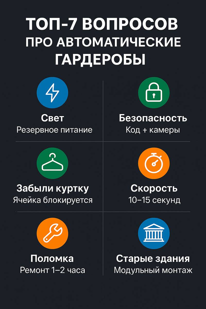 Управляющие торговых центров часто задают одни и те же вопросы про автоматические гардеробы. Собрал честные ответы на самые популярные из них. Система переходит на резервное питание — аккумулятор держит 30–40 минут. Если свет пропал дольше, есть ручная разблокировка ячеек по мастер-ключу. Ничего страшного. Вещь остаётся внутри, ячейка блокируется для других пользователей. Администратор может открыть её только через панель управления. В среднем 50 000–65 000 ₽: это профилактика, обновление ПО и электроэнергия. В десятки раз дешевле, чем зарплата гардеробщиц. Ключевые узлы дублируются, а при выходе из строя одного модуля остальные продолжают работу. Технический ремонт занимает 1–2 часа. Нет. Каждая ячейка открывается только по индивидуальному коду или RFID. Все действия фиксируются в журнале, а зона выдачи просматривается камерами. Среднее время обслуживания — 10–15 секунд. В пиковый час система пропускает до 450 человек. Очередей практически не остаётся. Да. Системы модульные, собираютс