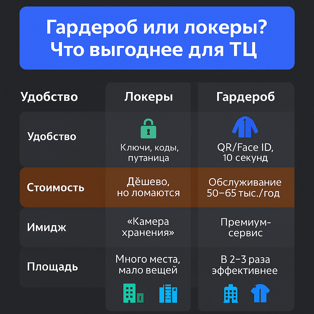 Тема хранения верхней одежды в ТЦ всегда вызывает вопросы. Что лучше: поставить автоматический гардероб или обойтись привычными локерами? Разбираем по ключевым критериям. Локеры: Автоматический гардероб: ✔ Для гостей гардероб удобнее: быстрее и привычнее, особенно в зимний сезон. Локеры: Автоматический гардероб: ✔ В долгосрочной перспективе гардероб выгоднее. Локеры: Автоматический гардероб: ✔ Гардероб усиливает бренд и добавляет «вау-эффект». Локеры: Автоматический гардероб: ✔ Гардероб эффективнее использует площадь, особенно в зонах с высокой проходимостью. Если нужен быстрый, удобный и имиджевый сервис — выбор в пользу автоматического гардероба очевиден.