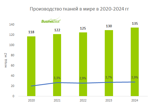За 2020-2024 гг производство тканей в мире выросло на 15%: со 118 до 135 млрд м2.