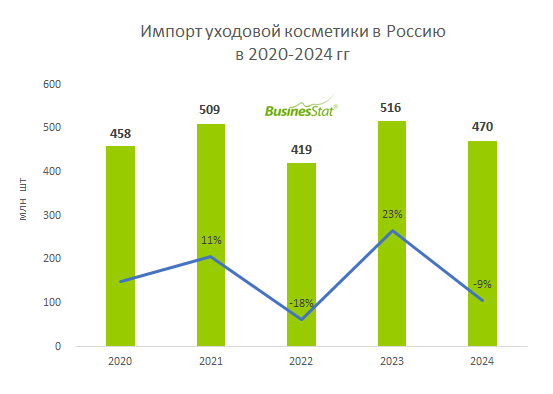 По данным «Анализа рынка уходовой косметики в России», подготовленного BusinesStat в 2025 г, в 2024 г ее импорт в страну снизился на 9% и составил 470 млн шт. Спад импорта стал следствием расширения ассортимента отечественной продукции. Зарубежные поставки средств для ухода за волосами, лицом и телом сократились. Доля зарубежной продукции на рынке остается весомой, но конкуренция с российскими производителями, успевшими за годы санкций завоевать доверие потребителей, обостряется. В 2023 г поставки уходовой косметики из-за рубежа выросли на 23%, полностью отыграв прошлогоднее падение. Основной вклад в увеличение импорта внесло наращивание поставок из Китая, Южной Кореи, Румынии и Беларуси. Рост импорта отмечался по всем видам уходовой косметики. В 2022 г импорт уходовой косметики сократился на 18%. Основными причинами послужили следующие факторы: В 2022 г значительнее всего сократились поставки из Франции, Германии, Италии и Румынии. Отметим, что в 2022 г Минпромторг легализовал схему п