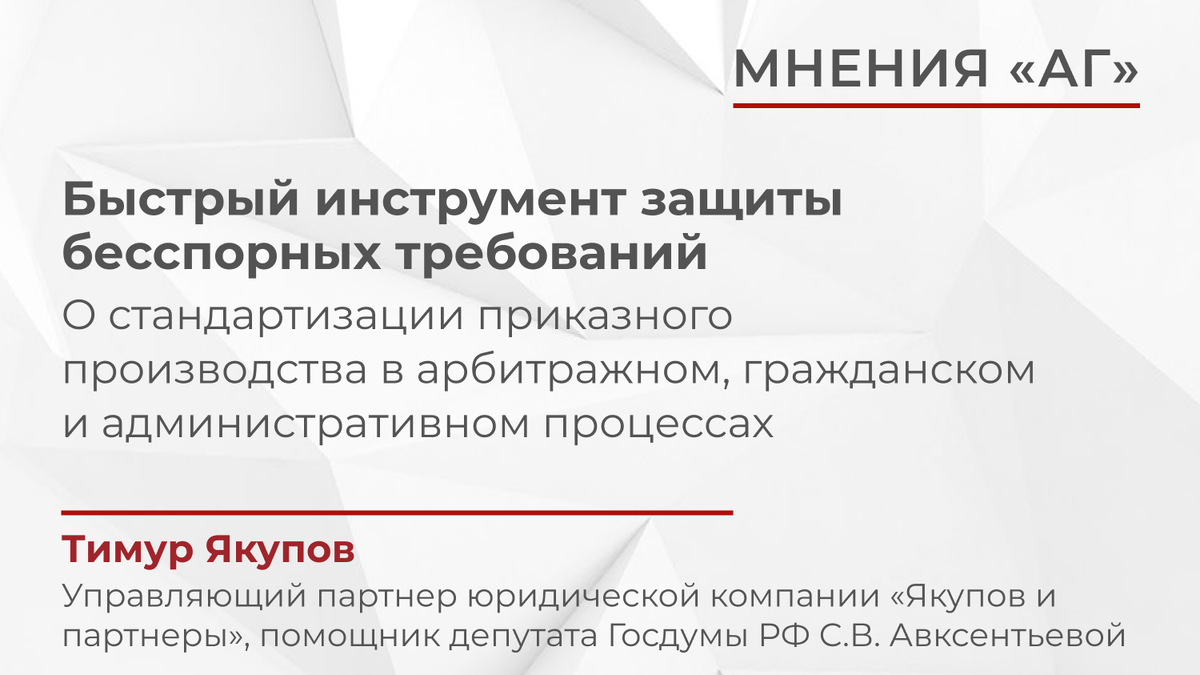 Управляющий партнер юридической компании «Якупов и партнеры», помощник депутата Госдумы РФ С.В. Авксентьевой Тимур Якупов о необходимости стандартизации приказного производства в арбитражном, гражданском и административном процессах. «Приведение норм ГПК, АПК и КАС к единому стандарту позволит укрепить правовую определенность, обеспечить баланс интересов сторон и снять зависимость процедуры от разъяснений высших судов», – полагает автор. Корни приказного производства в гражданском процессе уходят в дореволюционное процессуальное право. С приходом власти Советов институт приказного производства сохранился и был закреплен в ГПК РСФСР 1923 г., затем на некоторое время исчез с правового поля и вернулся спустя десятилетия – в 1995 г., когда глава о приказном производстве появилась в ГПК РСФСР 1964 г. Современное оформление институт получил в условиях современной России – в ГПК РФ 2002 г. Арбитражное и административное судопроизводства вооружились этим инструментом практически синхронно – в