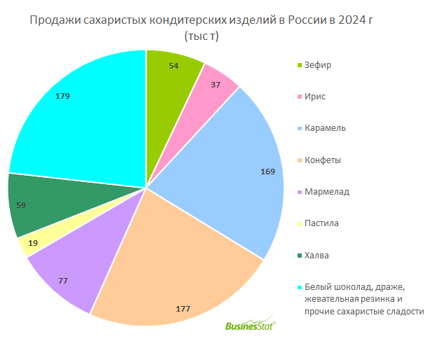 По данным «Анализа рынка сахаристых кондитерских изделий в России», подготовленного BusinesStat в 2025 г, за 2020-2024 гг их продажи в стране увеличились на 24%: с 638 до 788 тыс т. На продажи повлияло расширение ассортимента продукции в различных ценовых сегментах, появление на рынке нишевых изделий, например, с экзотическими вкусами, кондитерских продуктов, соответствующих требованиям здорового образа жизни (органических без искусственных добавок, на основе натуральных ингредиентов, с пониженным содержанием сахара). Развитие розничных торговых сетей, онлайн-торговли также влияет на потребление продукции. Самыми популярными сахаристыми кондитерскими изделиями в России в 2020-2024 гг были конфеты и карамель. Доля конфет в общих продажах снизилась за пять лет с 26% до 22%, доля карамели – с 26% до 21%. Карамель, которая состоит в основном из сахара, не воспринимается как полезный продукт. С другой стороны, сахаристые конфеты – один из самых доступных видов сладостей, которые включают в