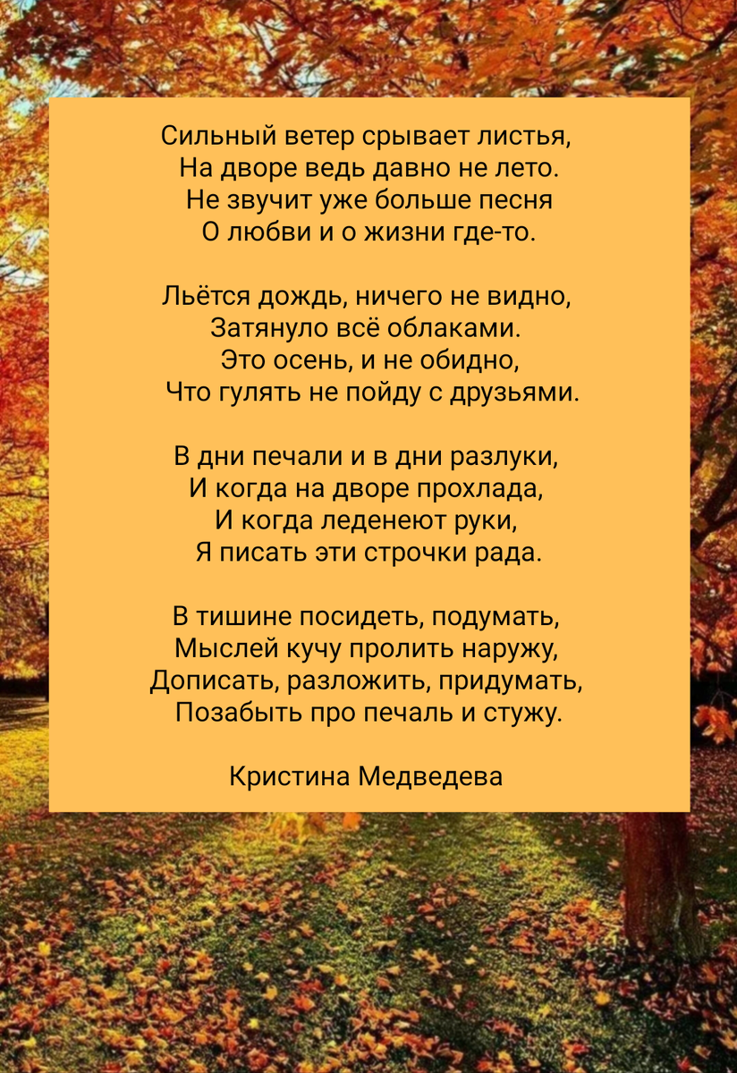 Сильный ветер срывает листья, На дворе ведь давно не лето. Не звучит уже больше песня О любви и о жизни где-то. Льётся дождь, ничего не видно, Затянуло всё облаками. Это осень, и не обидно, Что гулять не пойду с друзьями. В дни печали и в дни разлуки, И когда на дворе прохлада, И когда леденеют руки, Я писать эти строчки рада. В тишине посидеть, подумать, Мыслей кучу пролить наружу, Дописать, разложить, придумать, Позабыть про печаль и стужу. Кристина Медведева 🧡 🍁 / Снова осень и холода. Я налью себе крепкий чай, Просижу за столом допоздна И усну я за ним невзначай. И на улицу под дождём Выйду утром, на ту аллею Где когда-то гуляли вдвоём, Я забыть уже не сумею. Нарисую леса на холсте, Ведь природа мне как-то ближе. Мир увижу в ночной темноте, Окажусь я сейчас в Париже. И пусть дождик стирает мазки, Нарисую ещё таких кучу: Поля, солнце, моря и пески Или мрачную, чёрную тучу. Кристина Медведева 🧡 🍁 / Осень - это время тёплых пледов, Вечеров холодных у костра