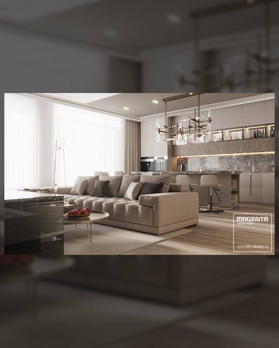 Стильная гармония, воплощенная в каждой детали Эскизы общей зоны в ЖК «Гродеков» — пространство гармонии элегантности и комфорта. Минималистичная кухня с матовыми фасадами и встроенной техникой создает ощущение единого целого, а мрамор с жилкой добавляет роскоши. Центральное место занимает остров с барной стойкой, мягкое освещение и теплый дуб в потолке и полу создают уют и тепло. Стеклянная перегородка расширяет перспективу, визуально увеличивая пространство. Свет в разных уровнях подчеркивает каждую деталь и добавляет глубины. Прикоснитесь к дизайну класса А: портфолио реализованных проектов — на сайте magentastudio.ru Magenta