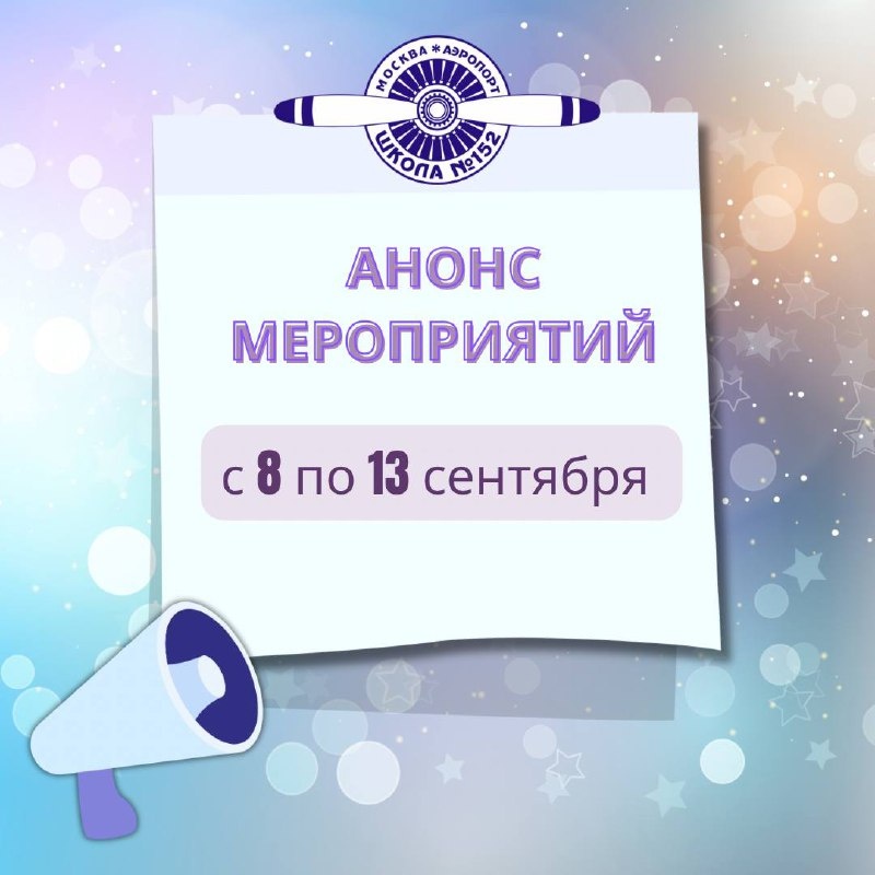 🗓️Анонс мероприятий Дорогие ученики! Первая учебная неделя позади! Надеемся, вы отлично стартовали и готовы к новым свершениям! План мероприятий с 8 по 13 сентября! ⬇️ 📍1-я Аэропортовская, д.1 9 по 13 сентября 🔸Пробный тур ВСОШ ( начало в 9:00 9 сентября, окончание 21:00 13 сентября) 11 сентября 🔸Акция «Родительский патруль» 🔸Выполнение нормативов ГТО 🔸Родительские собрания в 6-11-х классах, начало в 19:00 12 сентября 🔸«Активные перемены» - мастер-класс по оказанию первой помощи 13 сентября 🔸Слёт «Движения первых» 📍Константина Симонова, д.3 11 сентября 🔸Акция «Родительский патруль» 🔸Выполнение нормативов ГТО 📍Ленинградский пр-кт, д.46 8 сентября 🔸Активные перемены «Международный день грамотности» 9 по 13 сентября 🔸Пробный тур ВСОШ ( начало в 9:00 9 сентября, окончание 21:00 13 сентября) 10 сентября 🔸Родительские собрания 11 сентября 🔸Акция «Родительский патруль» 🔸День ПДД #ШколаВоплощающаяМечты #Школа152 #ДОНМ