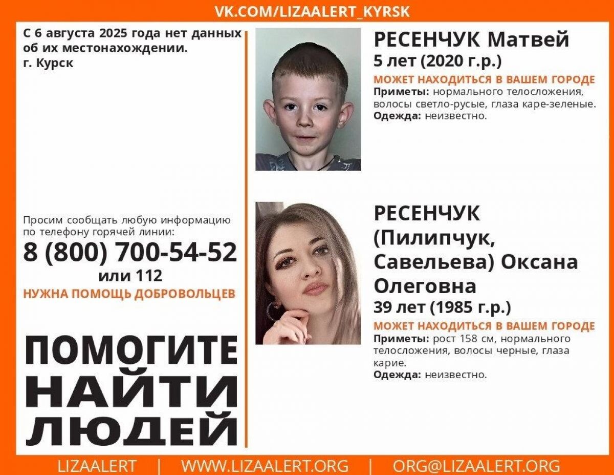 Оксана и Матвей проживают в Курске. 6 августа они вышли из дома в неизвестном направлении, и с тех пор о них нет никакой информации. Волонтеры поискового отряда «Лиза Алерт» сначала объявили поиски в Курской области, а после стало известно о возможном их нахождении на территории нашего региона. Матвею 5 лет, у него светло-русые волосы и каре-зеленые глаза, нормального телосложения. Его мама ростом 158 см, имеет черные волосы и карие глаза. С информацией о Матвее и Оксана просьба обратиться по номерам, указанным в ориентировке.