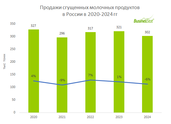 В 2020-2024 гг продажи сгущенных молочных продуктов в России снизились на 8%: с 327 до 302 тыс т.