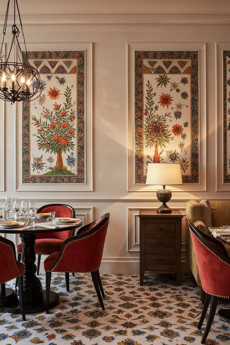 Северная история, застывшая в узоре. В настоящее время Русский дом активно развивает мебельную индустрию, и было бы очень интересно видеть в изделиях всё больше традиционных русских народных промыслов, выполненных мастерами! Сегодня расскажу про борецкую роспись, возникшую в XVIII веке на северодвинских землях Архангельской области. Мастера работают красными, оранжевыми, синими, зелёными, жёлтыми и чёрными красками. Сюжеты обычно лаконичны — птицы, древо жизни, цветы и простая геометрия (треугольники, кружки, ромбы). В интерьере роспись уместна на стенах, мебели, декоративных панно, ширмах и плитке; лучше использовать её как выразительный акцент — фриз, панель или вставку, чтобы сохранить баланс между традицией и современностью. Образцы можно увидеть в Музее истории города Кандалакша в Мурманской области. Фотографии этого интерьера сгенерированы искусственным интеллектом — krea.ai А куда бы вы поместили такой узор у себя дома? Остальные посты по этой теме вы можете найти в дайдж