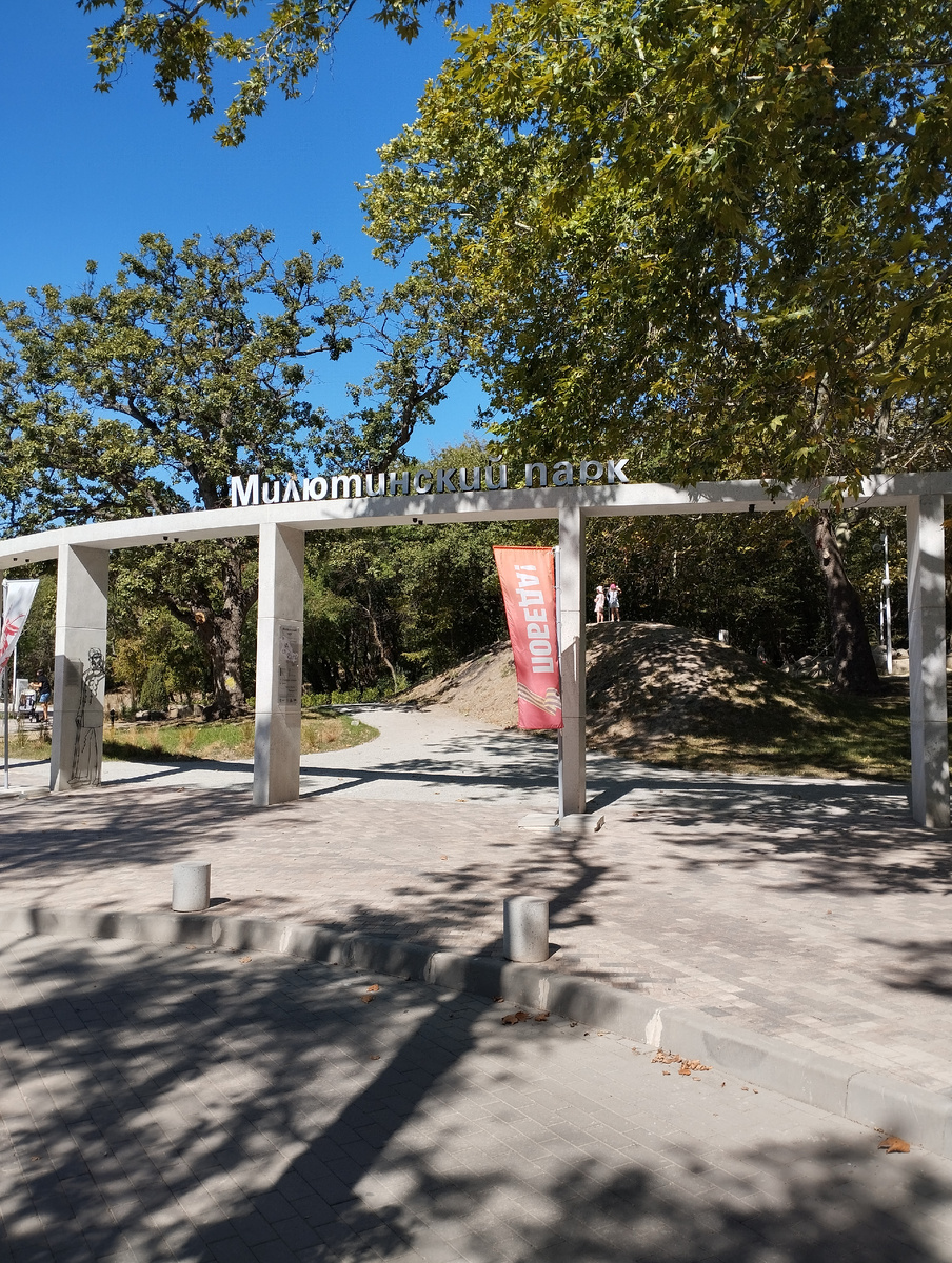 Весной нынешнего года открытие этого объекта очень охотно снимали все крымские видеоблогеры. Потому, планируя свой небольшой отпуск в Алупке, мне хотелось увидеть его своими глазами. Неожиданно выяснилось, что сделать это не так просто, если у тебя нет личного автомобиля. К счастью, можно воспользоваться общественным транспортом. С площади Ленина ходит в нужном направлении маршрутка номер 1. К моему крайнему удивлению, по графику. Еще и оплатить проезд легко с помощью смартфона. Мы в Донецке таких благ цивилизации ещё не видели. Как не видели подобных новых белых автобусов. Ехать пришлось по местному узкому серпантину минут двадцать до рынка. А оттуда пешком всего минут пять пешком, но... Нужно знать секретную тропу через дворы, а затем вдоль дороги. Вход впечатляет. На одной из колонн вот такое изображение графа Дмитрия Милютина. Во времена правления императора Александра Второго он был военным министром. Весьма выдающимся. Его по праву считают отцом российской армии. Как и многие з