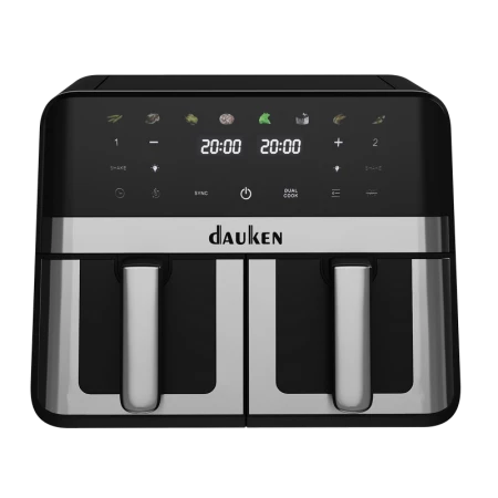 Введение Dauken AG920 AirFlex DuoCook — это многофункциональный аэрогриль нового поколения, который объединяет возможности сразу шести кухонных приборов. Секрет его эффективности — технология DuoCook (двойной нагрев) и система AirFlex (циркуляция горячего воздуха). Благодаря им блюда готовятся быстро, равномерно и практически без масла. Это отличное решение для тех, кто ценит вкусную, полезную еду и удобство в приготовлении. Модель выполнена в стильном черно-металлическом корпусе с прозрачной дверцей из жаропрочного стекла. Благодаря компактным габаритам аэрогриль легко разместится даже на небольшой кухне, не занимая лишнего пространства. 1. DuoCook — двойной нагрев для идеального результата 2. AirFlex — циркуляция горячего воздуха Равномерное приготовление без «сырых» участков, как это бывает в обычной духовке. ✔ Экономия времени — готовка в 2 раза быстрее, чем в духовке.