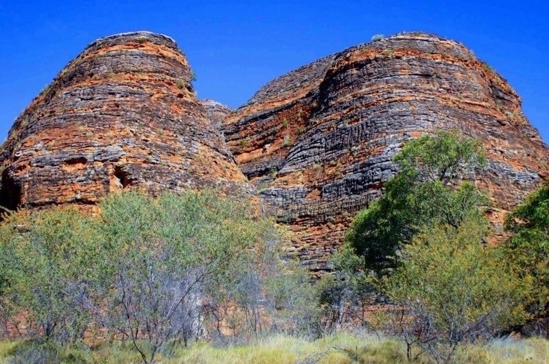 Разноцветный хребет Бангл-Бангл Хребет Бангл-Бангл — это уникальное геологическое образование в Национальном парке Пурнулулу на северо-западе Австралии. Он знаменит своими полосатыми куполообразными конструкциями из песчаника, напоминающими пчелиные улья. Его высота достигает 578 м над уровнем моря, а отдельные купола возвышаются на 200–300 м над окружающей травяной равниной. Считается, что этим образованиям более 350 миллионов лет: такие формы возникли из-за многомиллионолетней эрозии и геологических процессов после поднятия местности примерно 20 млн лет назад. Бангл-Бангл состоит из чередующихся полос песчаника оранжевого, чёрного и белого цвета. Оранжевые полосы образуются за счёт наличия в породе оксидов железа и марганца, а тёмные — благодаря цианобактериям, способным удерживать влагу на поверхности. Эта структура делает хребет чрезвычайно устойчивым к разрушению во время сезона дождей. Климат местности контрастный: есть жаркое влажное лето и сухая мягкая зима, а годовая норма