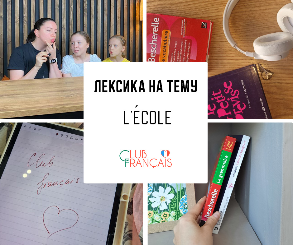 • L'école [lekɔl] — Школа • Le lycée [lə lise] — Лицей (старшая школа) • Le collège [lə kɔlɛʒ] — Колледж (средняя школа) • Le directeur [lə diʁɛktœʁ] — Директор • Le professeur [lə pʁɔfɛsœʁ] — Учитель • L'élève [lelɛv] — Ученик • Le cahier [lə kaje] — Тетрадь • Le livre [lə livʁ] — Книга • Le stylo [lə stilo] — Ручка • Le crayon [lə kʁɛjɔ̃] — Карандаш • La gomme [la gɔm] — Ластик • La règle [la ʁɛɡl] — Линейка • Le cartable [lə kaʁtabl] — Рюкзак • Les ciseaux [le sizo] — Ножницы • Les matières [le matjɛʁ] — дисциплины • Les mathématiques [le matematik] — Математика • L'histoire [listwaʁ] — История • La géographie [la ʒeɔgʁafi] — География • Les sciences [le sjɑ̃s] — Естественные науки • La physique [la fizik] — Физика • La chimie [la ʃimi] — Химия • L'anglais [lɑ̃ɡlɛ] — Английский язык • L'art [laʁ] — Искусство • Le cours [lə kuʁ] — Урок • La récréation [la ʁekʁeasjɔ̃] — Перемена • Les devoirs [le dəvwaʁ] — Домашнее задание • L'examen [lɛɡzamɛ̃] — Экзамен • La note [la nɔt] — Оценка