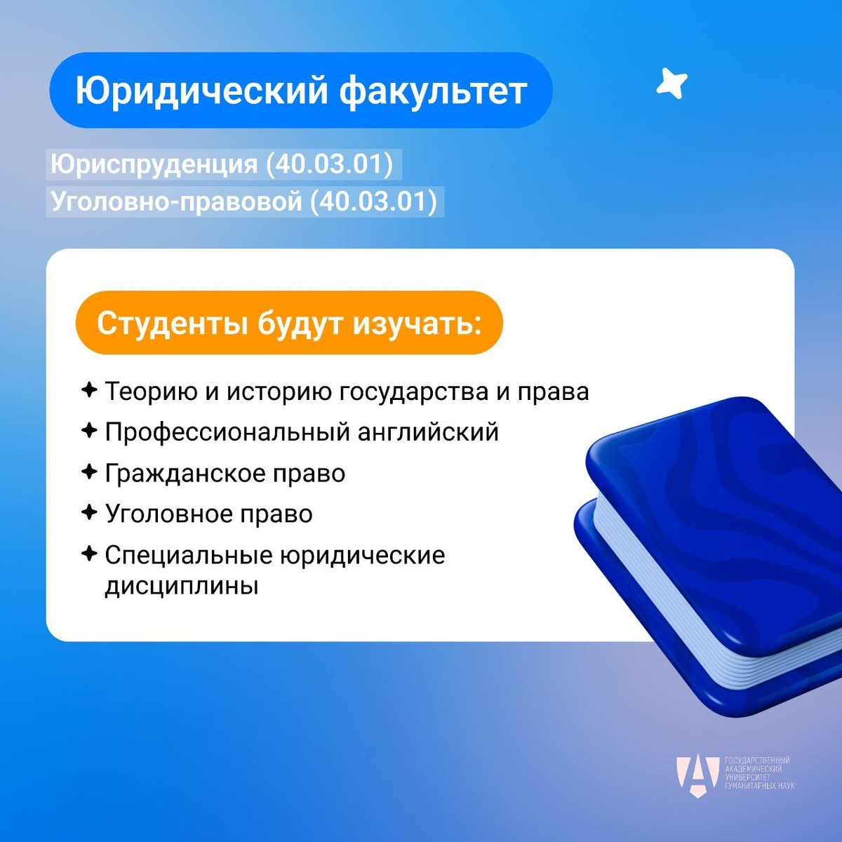 🏁 Сегодня мы завершаем рубрику о факультетах нашего Университета #инфографика_ГАУГН! 📌 Сегодня в фокусе Юридический факультет ГАУГН. ❓ Если у вас остались вопросы или захотелось узнать о факультете больше – пишите в комментарии и обязательно загляните на наш сайт! #юристыГАУГН #ГАУГН #простРАНство_ГАУГН #gaugn_live