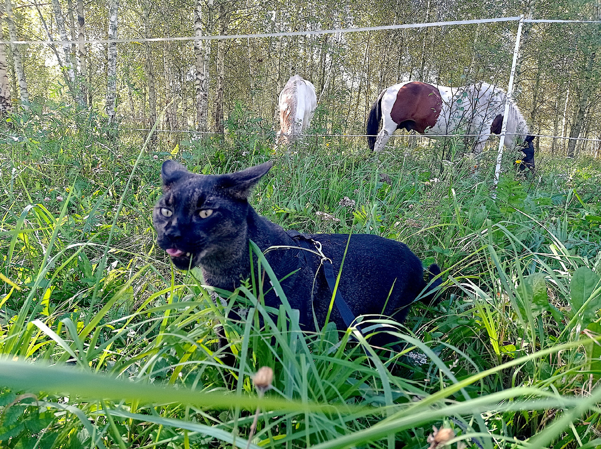 У этой прогулки была конкретная цель – познакомить Лимона с лошадьми. Я решила воспользоваться ситуацией, когда электропастух стоит совсем возле дома и кони пасутся буквально в десяти метрах, да и кот все более и более уверенно ведет себя на улице, поэтому надо повышать уровень сложности, расширяя его горизонты. В самый первый раз, когда Чино стал приближаться к Лимону, у чаузи возникла паника и он побежал прочь. Это было где-то в середине лета, кажется. Следующие пару раз мы с котом просто ходили электропастуха, знакомясь с конями на расстоянии. Затем, раз на пятый, когда мы вновь подошли к жеребцам и Лимону захотелось убежать, я придержала его. Разумеется, несильно: удержать паникующего кота размером с собаку (или даже больше, учитывая современных питомцев) в шлейке абсолютно нереально. Поэтому я именно попросила его остановиться и не бежать – аккуратно, но настойчиво. И он согласился. Оказалось, что кони не такие уж и монстры. По крайней мере можно не улепетывать от них куда глаза г