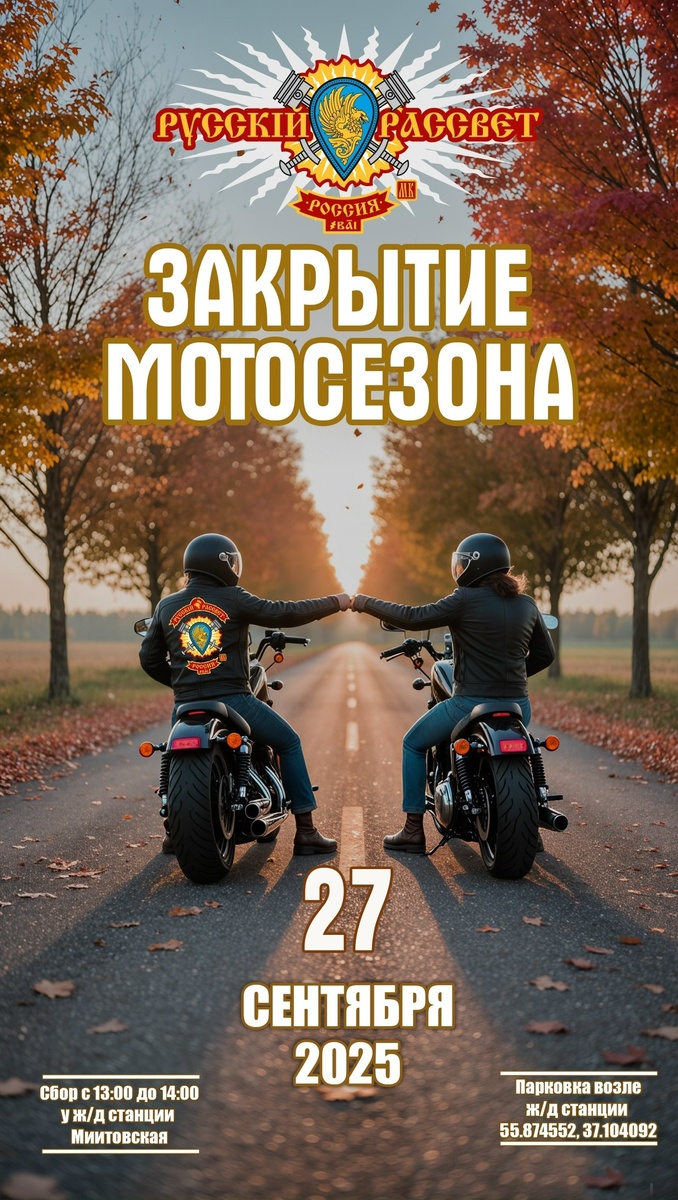 🔁 Дальняк.рф™: Дорогие друзья, товарищи, а также любители мотоциклов! Спешим сообщить, что Закрытие Мотосезона - 2025 года с мотоклубом «Русский Рассвет МК» состоится 27 сентября 2025 года! ВНИМАНИЕ место встречи: на автомобильной парковке у железнодорожной станции «Миитовская»! Адрес места встречи: Московская область, городской округ Истра, Дедовск, улица МПС 40-й километр, Автомобильная парковка. Сбор участников в 13:00 Старт колонны в 14:00 Точка сбора: Координаты: 55.874552, 37.104092 Яндекс карты: https://yandex.ru/maps/-/CLQBaO5K Гугл карты: https://maps.app.goo.gl/CMeRjywNjTyM2qn56 Панорама: https://yandex.ru/maps/-/CLQBaDPm Приглашаем всех 27 сентября 2025 года проводить Мотосезон - 2025! Всегда с вами, команда мотоклуба "Русский Рассвет МК"!