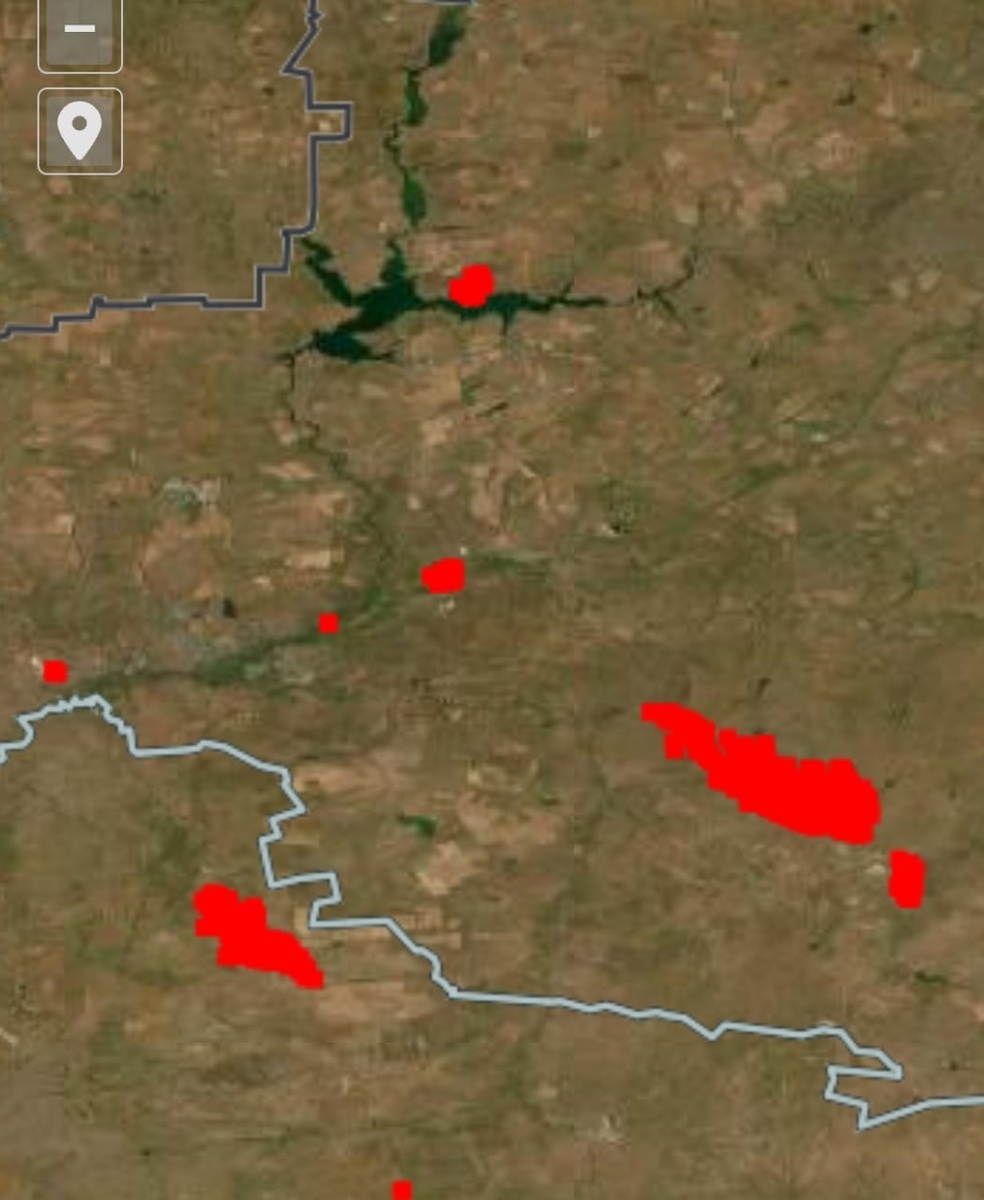 Пожары на востоке. На карте тепловых аномалий видно, что пожары сегодня бушуют в Кувандыкском округе, в Домбаровском районе, Кваркенском районе, вблизи Орска, а также в Казахстане в районе границы с Оренбургской областью.