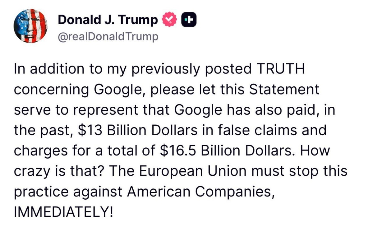 Trump claims in Truth Social that Europe is FALSELY charging Google MASSIVE fines