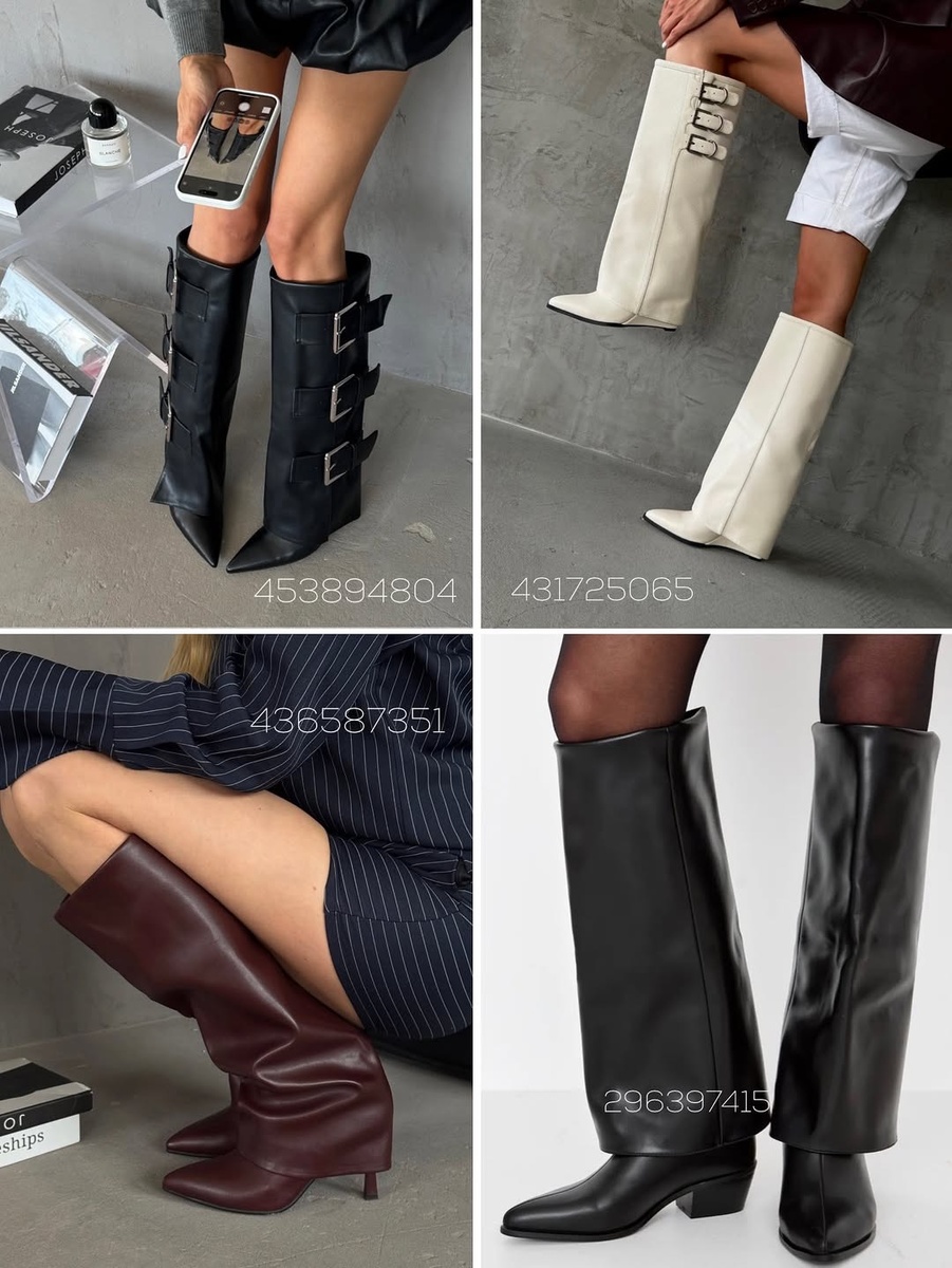 - Характер: драматичные, архитектурные, с острим носком и высоким голенищем. Три широкие ремня с крупными пряжками не просто декор — они визуально «стягивают» голень, делая ее стройнее.