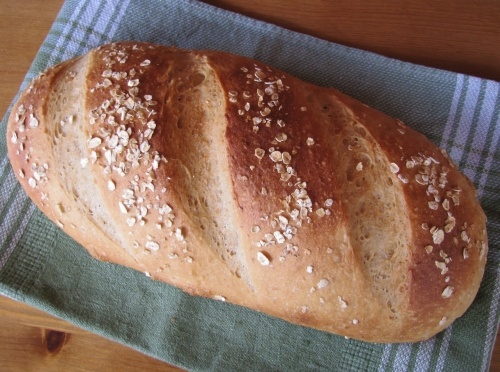 Перед выпечкой батон слегка смажьте водой, сделайте надсечки и присыпьте для украшения овсяными хлопьями.