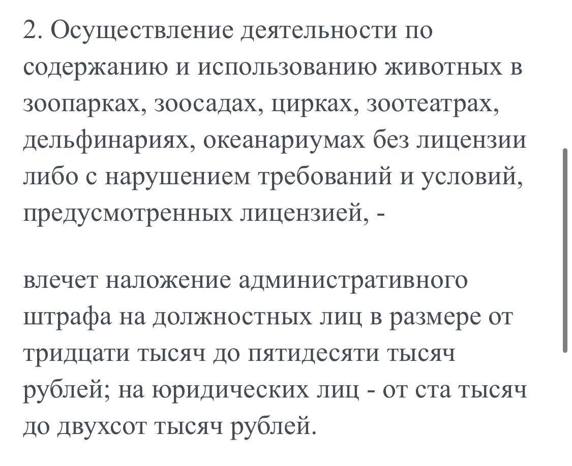 Не так давно в отношении кафе, где посетителям в качестве живых ”игрушек" предоставлялись собаки породы Мальтипу, начат ряд проверок. Но касаются они только организаторов этого жестокого бизнеса: арендодатель, собственник одного из ТРЦ в Москве, за это ответственности не понесет. Возможно, Зубков тоже выступает в качестве такого ”арендодателя”, чтобы уйти от ответственности за организацию фотозоны с хищниками. Штрафы для подставных лиц по закону будут минимальными. Часть вторая статьи 8.53 КОАП: • "Осуществление деятельности по содержанию и использованию животных в зоопарках, зоосадах, цирках, зоотеатрах, дельфинариях, океанариумах без лицензии либо с нарушением требований и условий, предусмотренных лицензией, - влечет наложение административного штрафа на должностных лиц в размере от тридцати тысяч до пятидесяти тысяч рублей; на юридических лиц - от ста тысяч до двухсот тысяч рублей". Но в этой административной статье нет упоминания о частных лицах и ИП. Индивидуальных предпринимателе