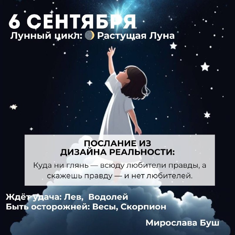 6 сентября РЕКОМЕНДАЦИИ: ⚠️ Критический день перед полнолунием, когда активизируется внутреннее начало каждого человека, поддающееся земным соблазнам. 👁 Защищайте себя от атак и делайте очищающие практики, чтобы не сбиться с намеченного пути. 💔 День может принести кратковременное блаженство, которое сменит горькое разочарование, что особенно характерно для любви и более интимных отношений… ✉️ Подписаться на Мирославу #прогнознадень
