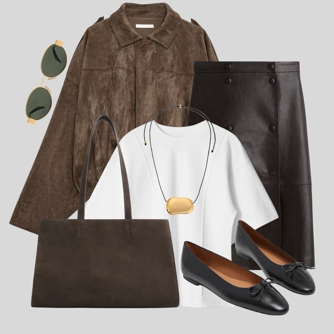 Осень — время фактур, спокойных оттенков и продуманных деталей. На коллажах — две безупречные формулы «умной базовой» элегантности: шоколадно-кофейная палитра, кожа и замша, лаконичная бижутерия и самая универсальная обувь сезона — балетки. Разбираем каждый образ по косточкам: что за вещь, как сидит, зачем она здесь и как адаптировать под вашу фигуру и погоду.
