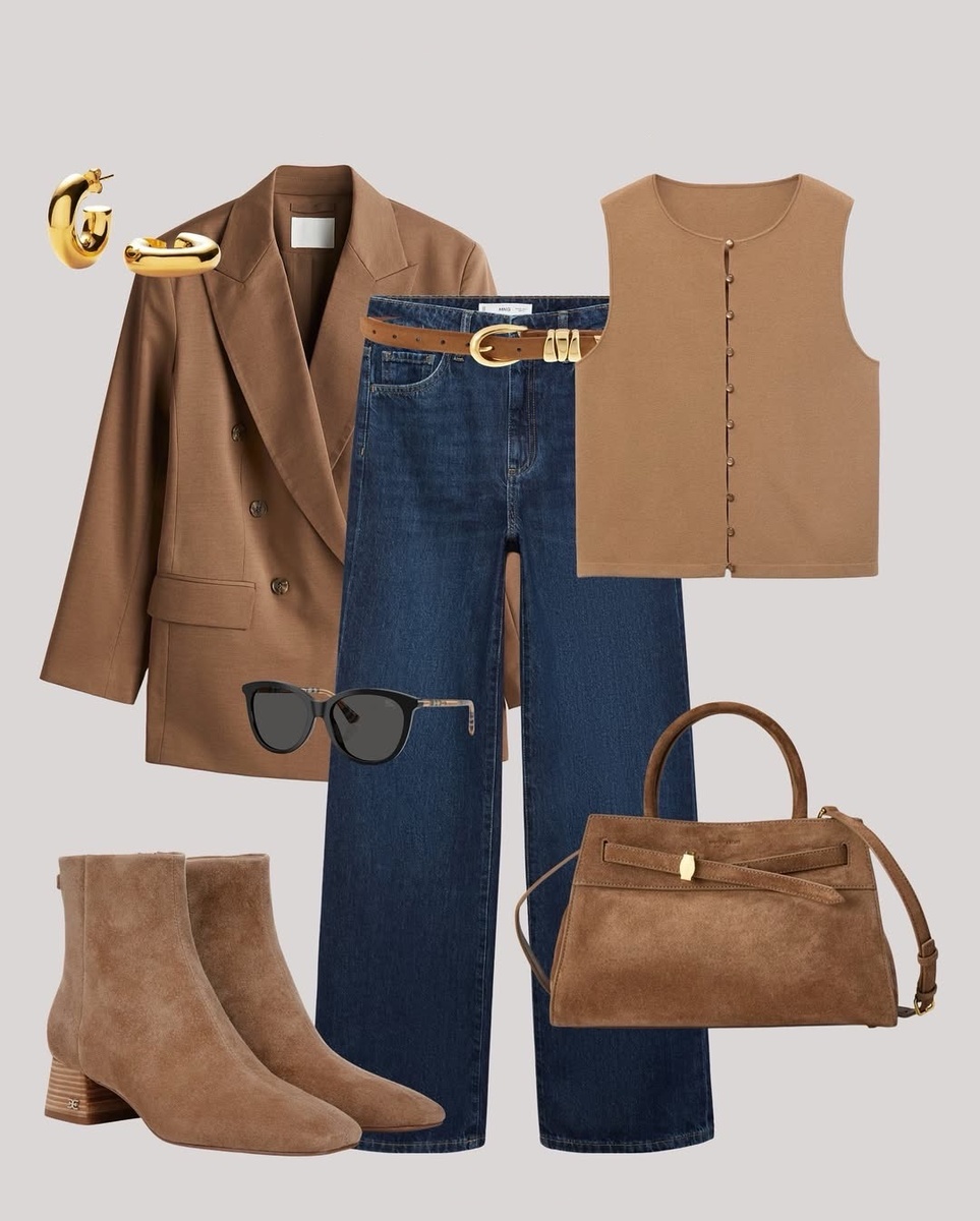 Палитра: тёмный шоколад, коньяк, золотая фурнитура, чистый деним.