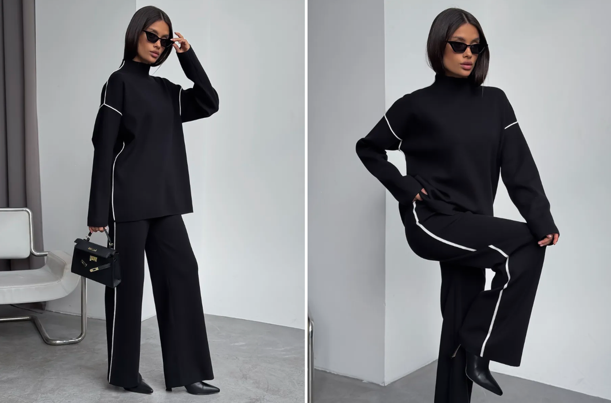 Элегантный трикотажный костюм от бренда MilaDia One сочетает стиль и комфорт, создавая гармоничный образ для демисезонного гардероба. В комплект входит свободный свитер с длинными рукавами и прямые брюки с аккуратными белыми кантами по швам, которые визуально вытягивают силуэт.