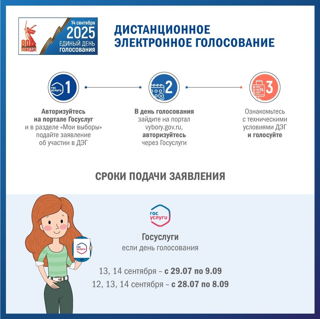 С 12 по 14 сентября в республике пройдут выборы главы Республики Коми, депутатов Государственного Совета, а также выборы в органы местного самоуправления. Проголосовать можно на своём избирательном участке по месту регистрации, а также в форме дистанционного электронного голосования (ДЭГ). Для этого до 8 сентября необходимо подать заявку на участие в ДЭГ через портал Госуслуги, а в дни голосования проголосовать дистанционно в любое удобное время с 8:00 12 сентября до 20:00 14 сентября, не посещая избирательный участок.